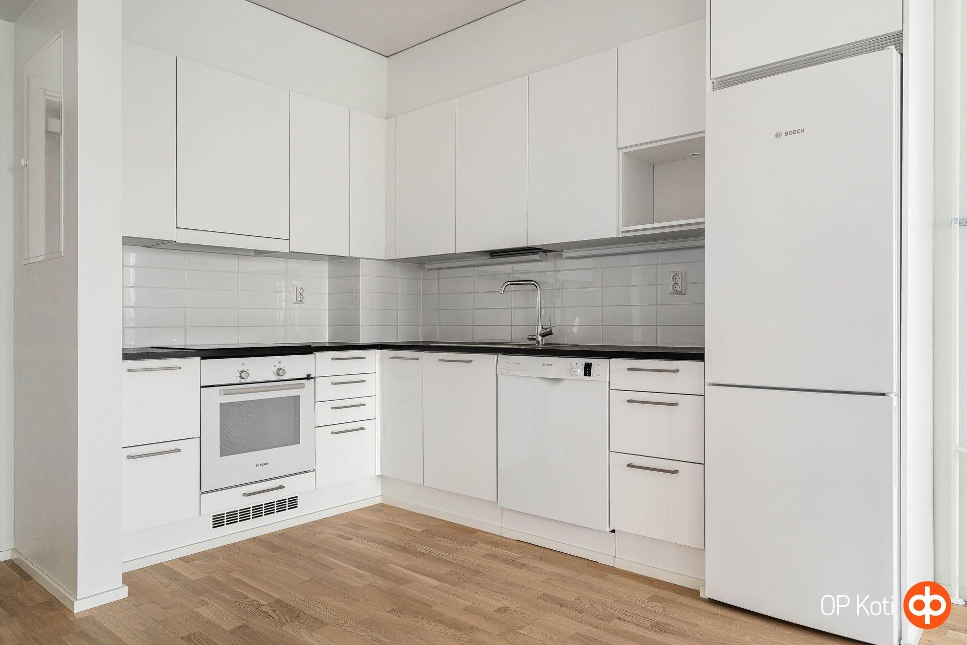 - Jääkaappipakastin, erillisuuni, liesitaso, liesituuletin, astianpesukone, kaapistot, kiinteät valaisimet.