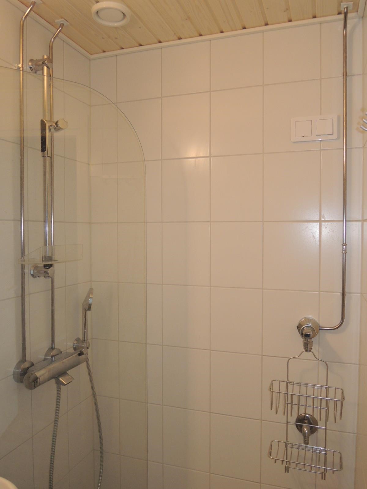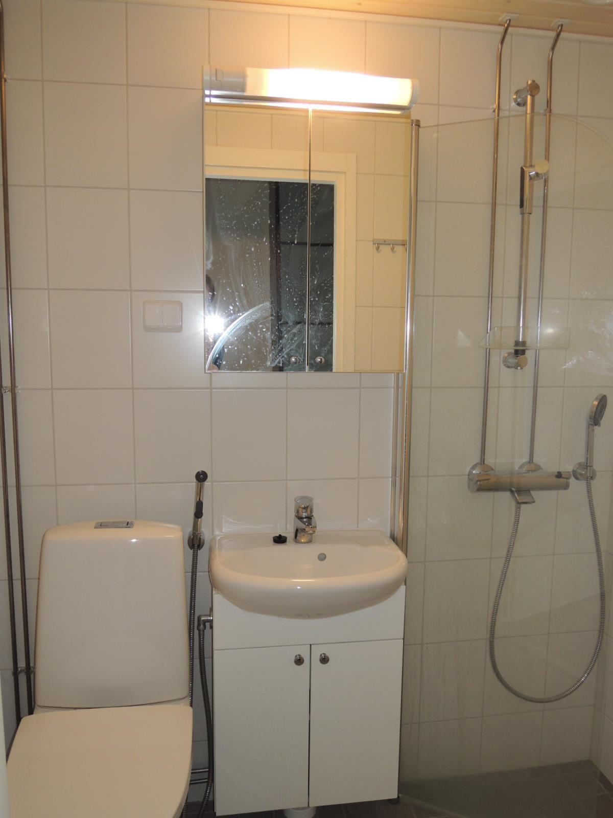 - Suihku, suihkuseinä, peilikaappi, allaskaappi, pesukoneliitäntä, lattialämmitys.