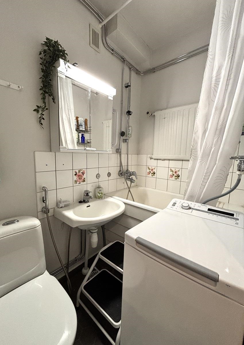 - Kylpyhuone/wc.ssä on suihku, amme, peilikaappi ja pesukoneliitäntä.