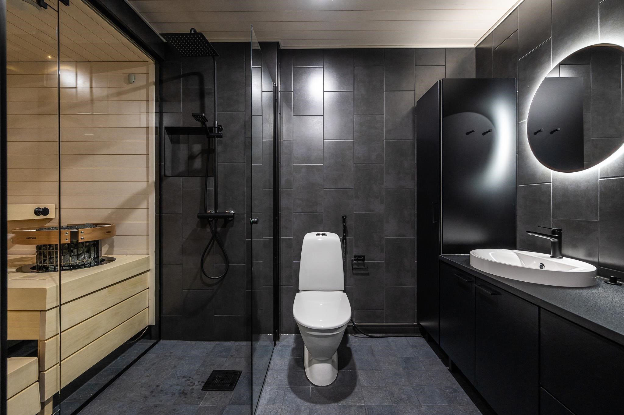 - Sauna, sähkökiuas, kylpyhuone, erillinen wc, suihku, pesukoneliitäntä, lattialämmitys.