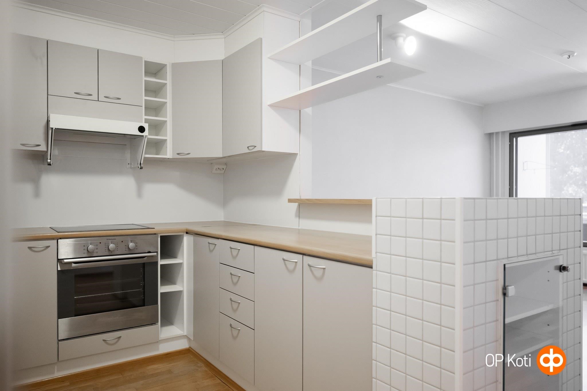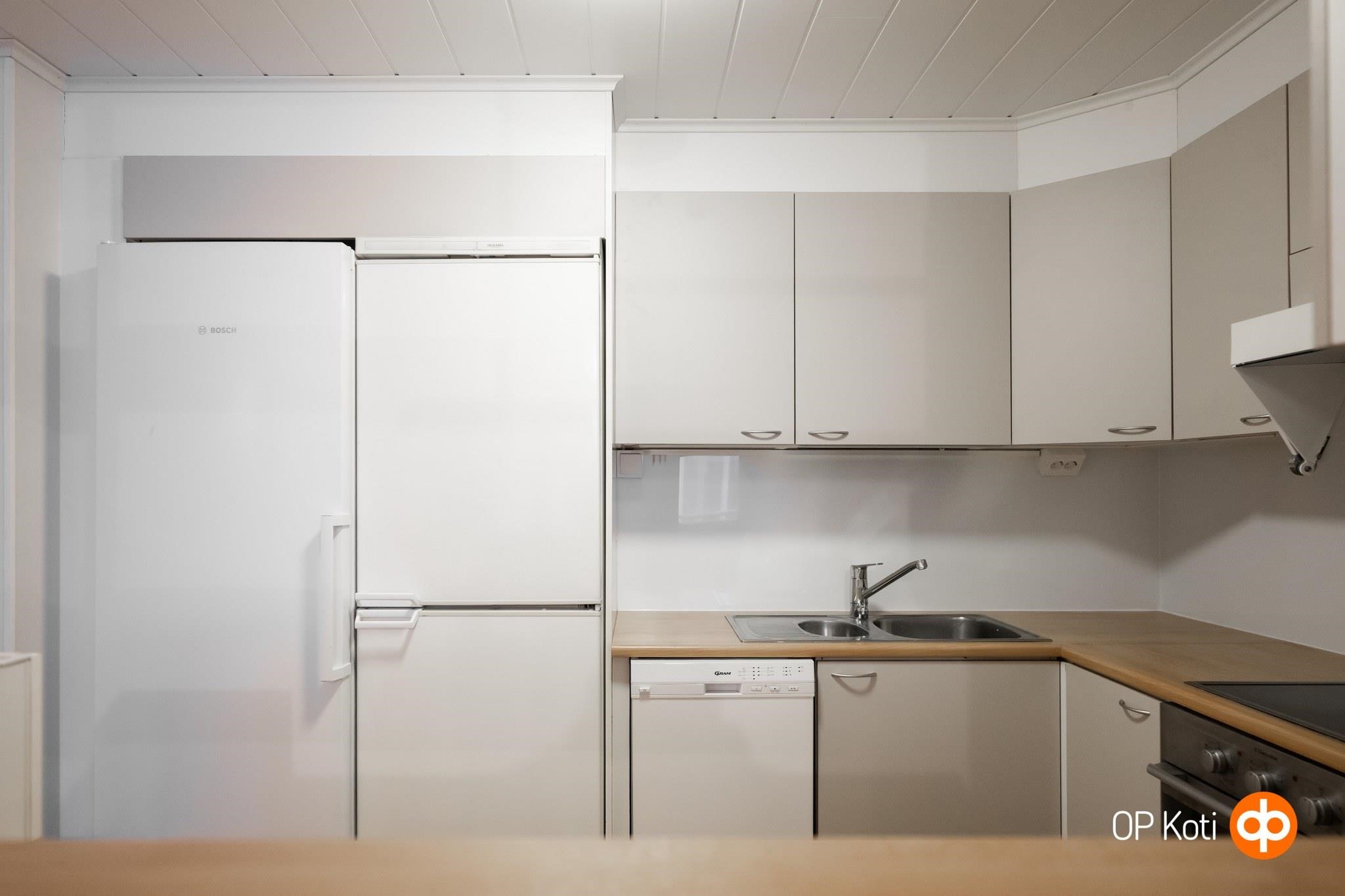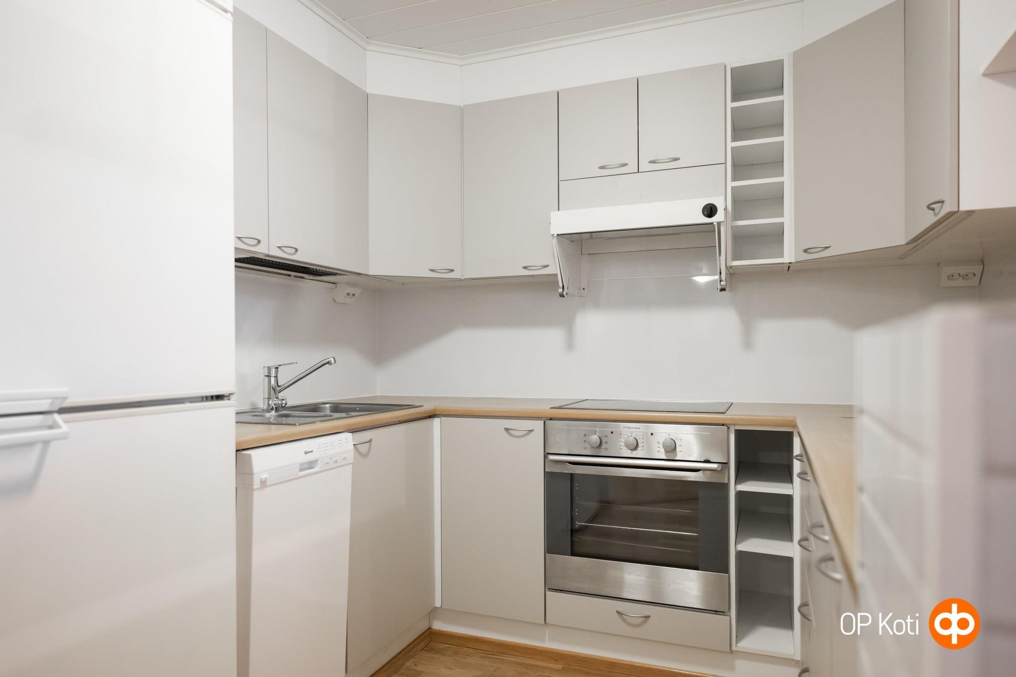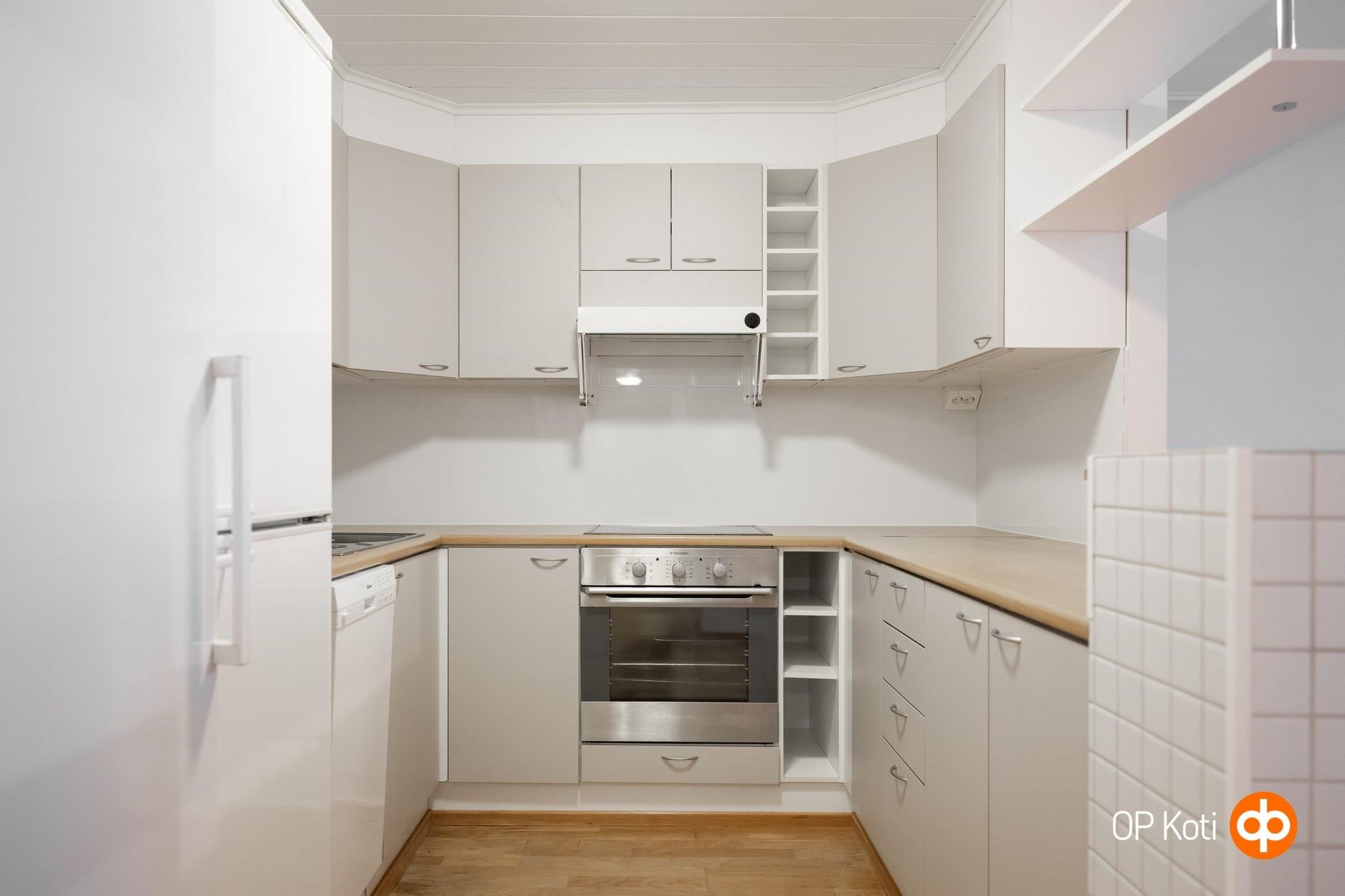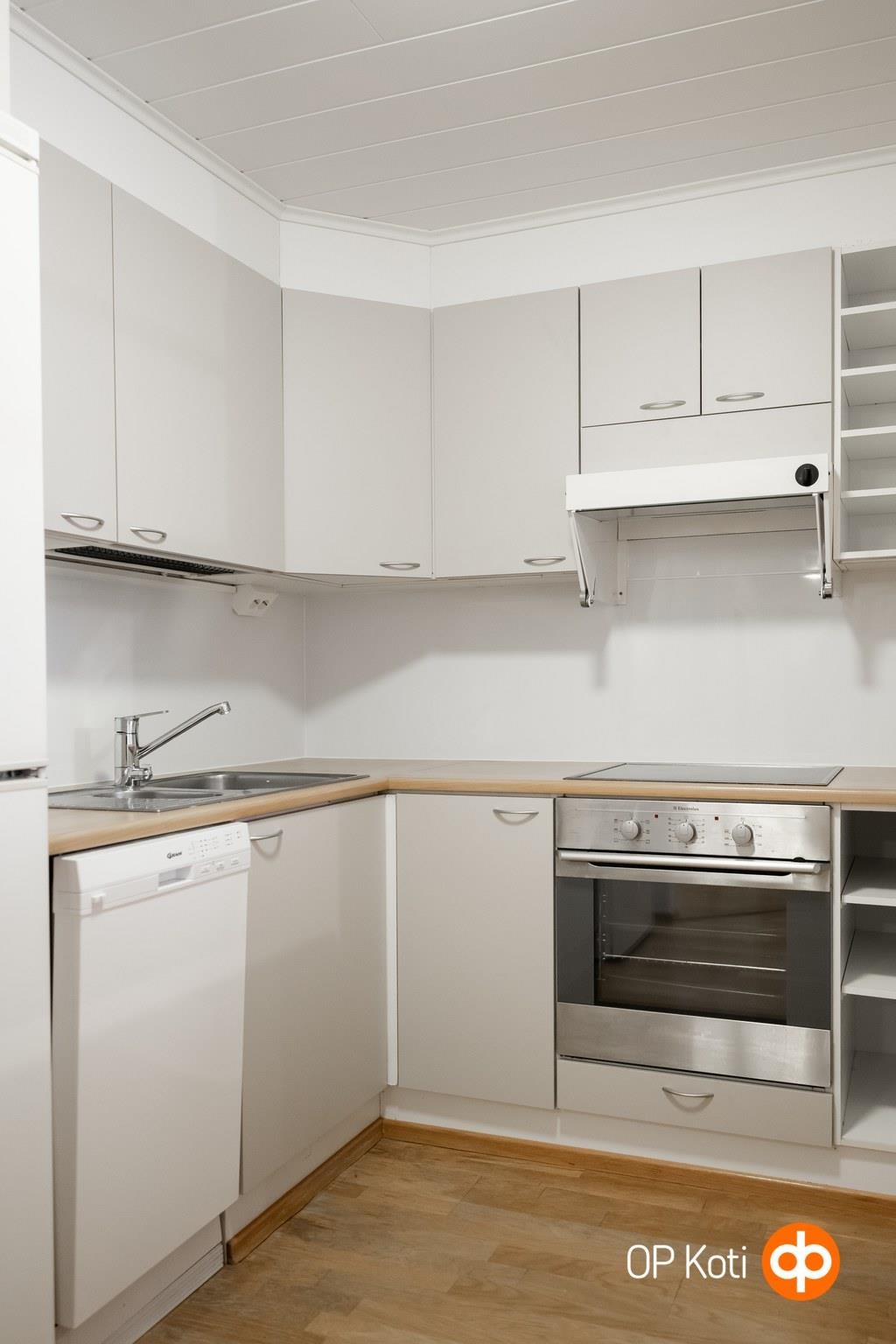 - Jääkaappipakastin, erillisuuni, liesitaso, keraaminen liesi, liesituuletin, astianpesukone, kaapistot, kiinteät valaisimet.