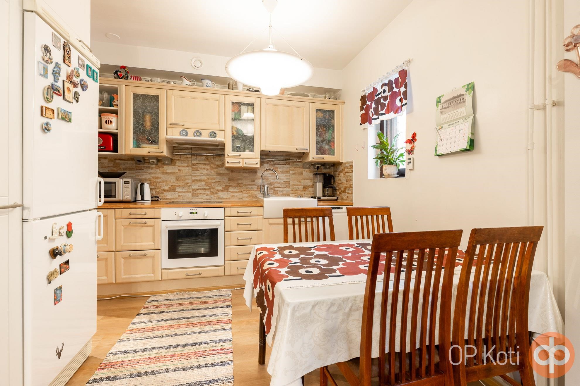 - Jääkaappipakastin, liesitaso (keraaminen), liesituuletin (suodatin), astianpesukone (45 cm leveä), kaapistot, kiinteät valaisimet.
