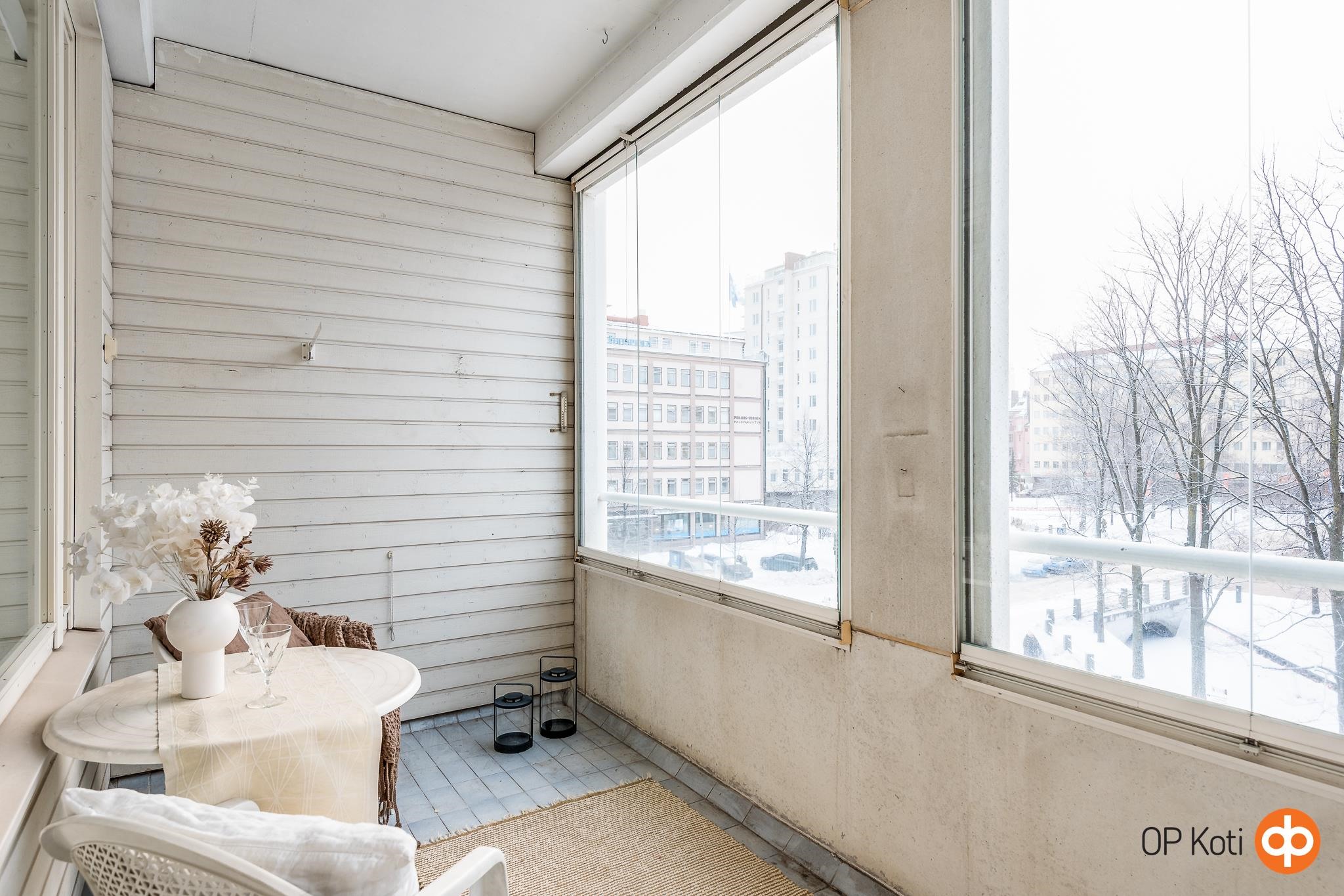 Huoneiston toimiva pohjaratkaisu tekee arjesta sujuvaa. Keittiö avautuu olohuoneeseen, josta on käynti etelään avautuvalle lasitetulle parvekkeelle. Parvekkeelta avautuvat kauniit näkymät Oulun kaupungintalon ja Rotuaarin suuntaan, täydellinen paikka nauttia aamukahvi ja ihastella näkymää. Asunnon sauna tuovat asumiseen arjen luksusta. Säilytystilaa löytyy runsaasti useiden komeroiden ansiosta, ja lisäksi käytössäsi on erillinen huoneistokohtainen varasto.