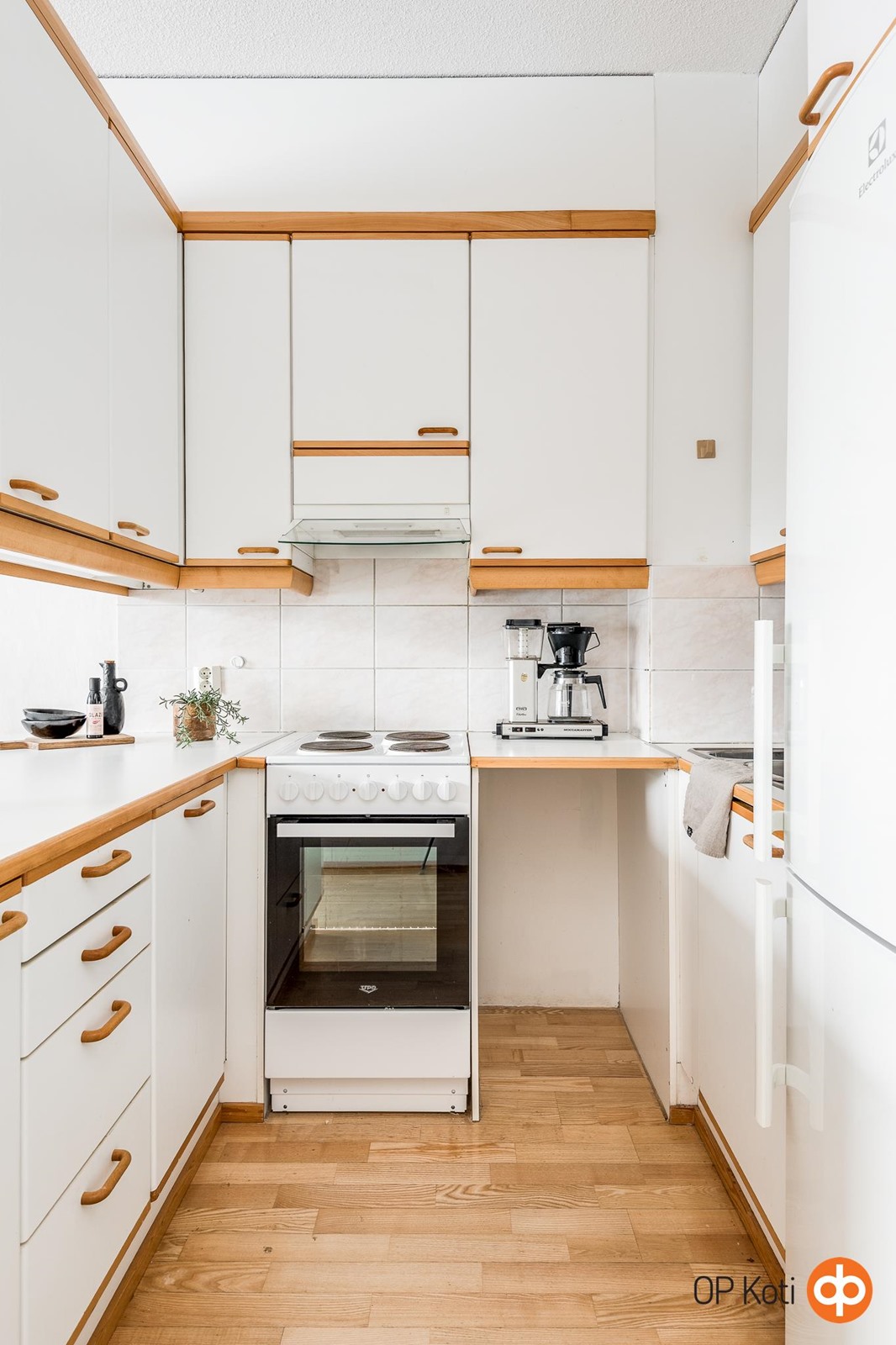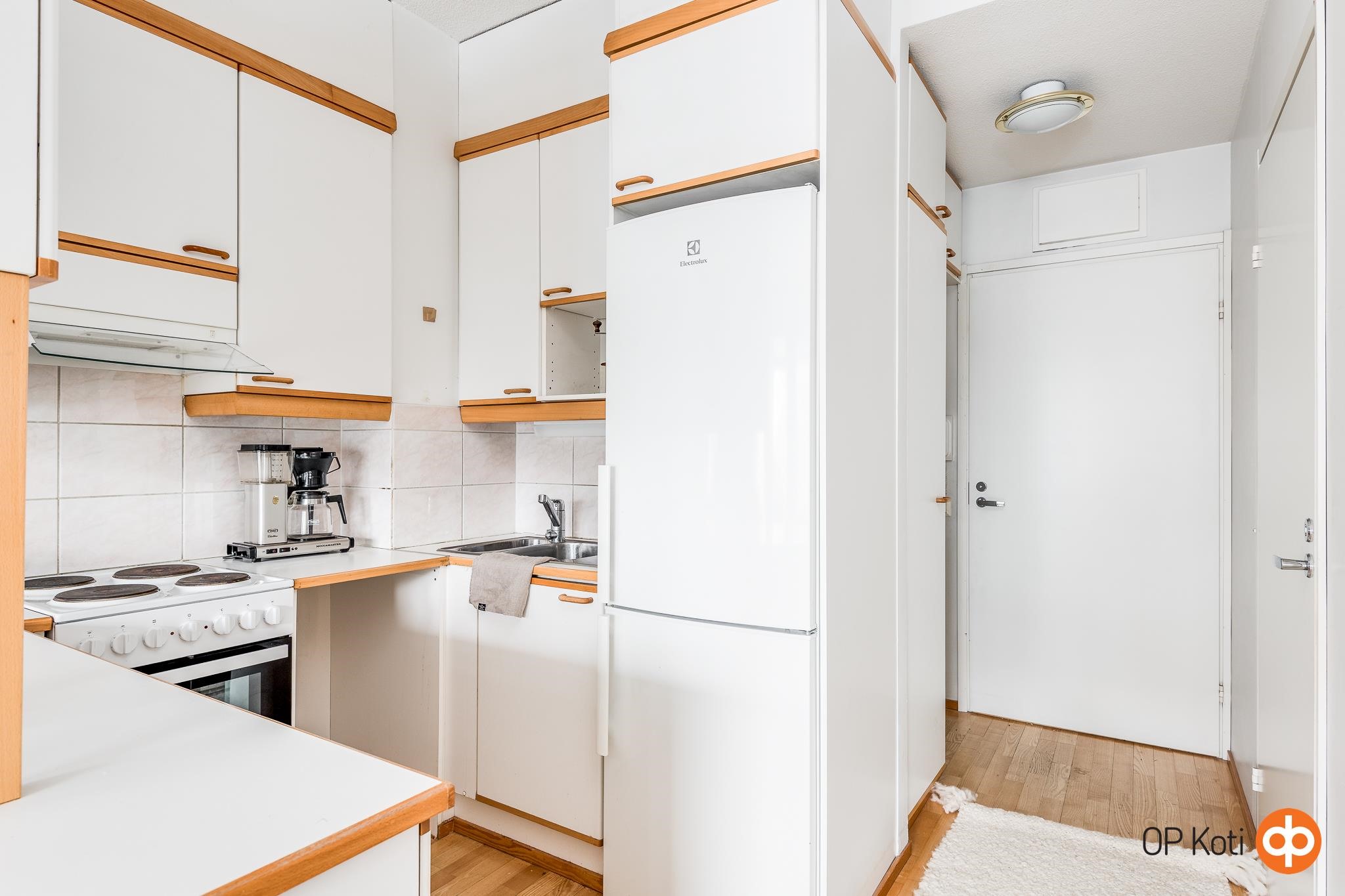 - Jääkaappipakastin, lattialiesi, sähköliesi, liesikupu (aktiivihiilisuodatin), kaapistot.