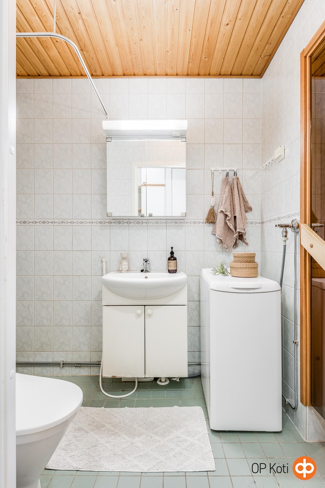 - Sauna, sähkökiuas, kylpyhuone, suihku, peilikaappi, allaskaappi, pesukoneliitäntä, lattialämmitys, kiinteät valaisimet.