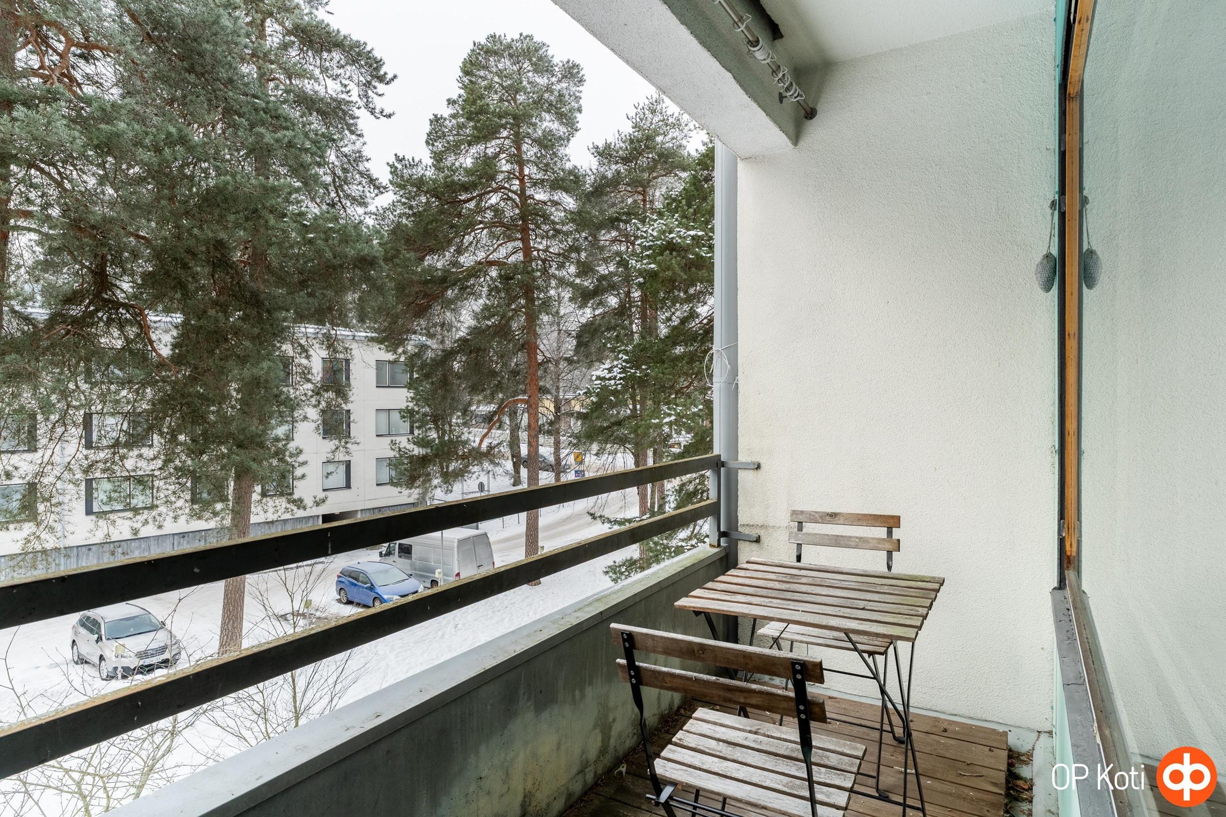 Olohuoneesta on käynti parvekkeelle, josta avautuu näkymä rauhalliselle pihalle. Kaksi makuuhuonetta mahdollistavat joustavan käytön niin perheelle, työtilaksi kuin vierashuoneeksikin.