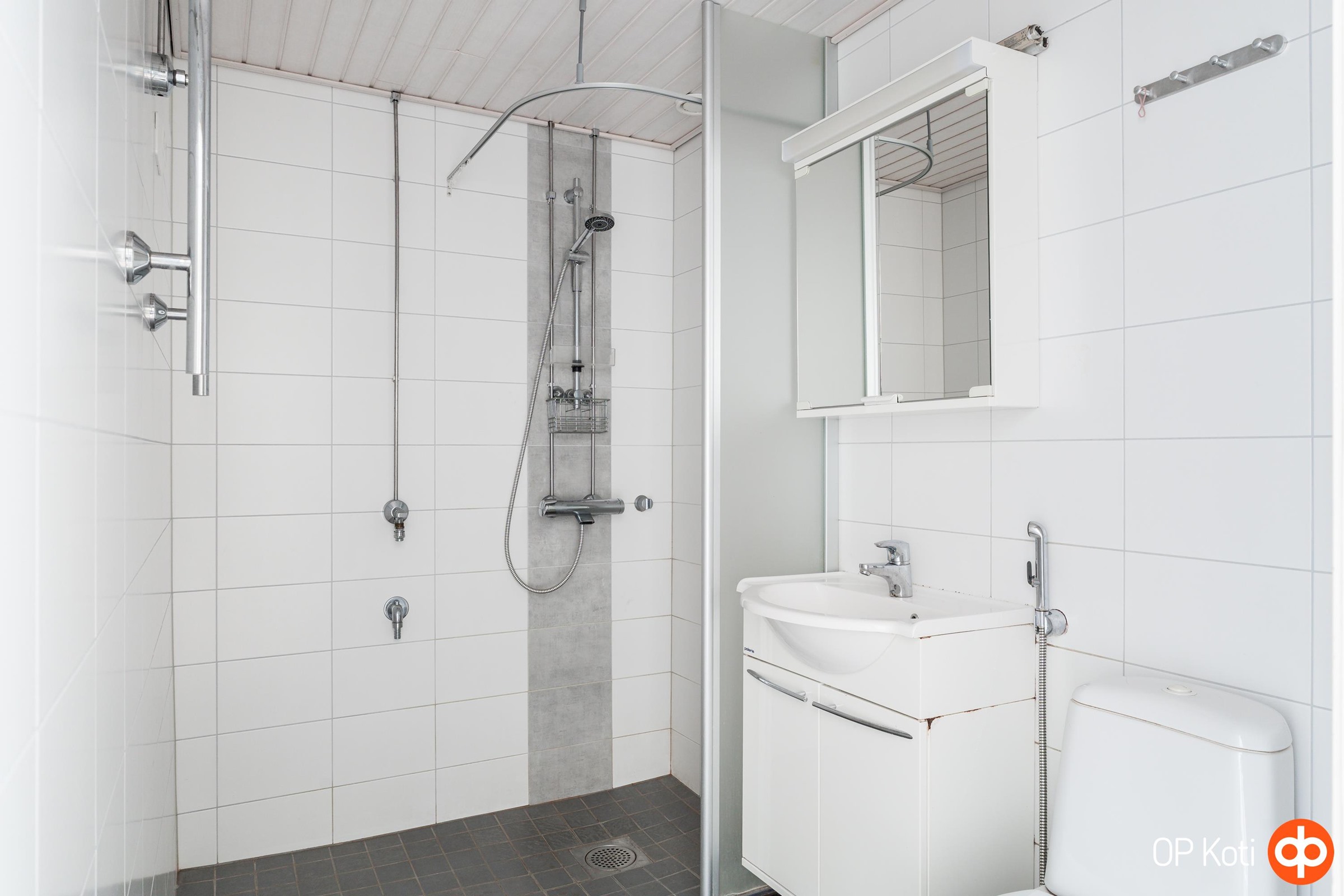 - Kylpyhuone, suihku, suihkuseinä syvyys noin 40 cm, peilikaappi, allaskaappi, pesukoneliitäntä, kiinteät valaisimet. Remontoitu linjasaneerauksen yhteydessä.