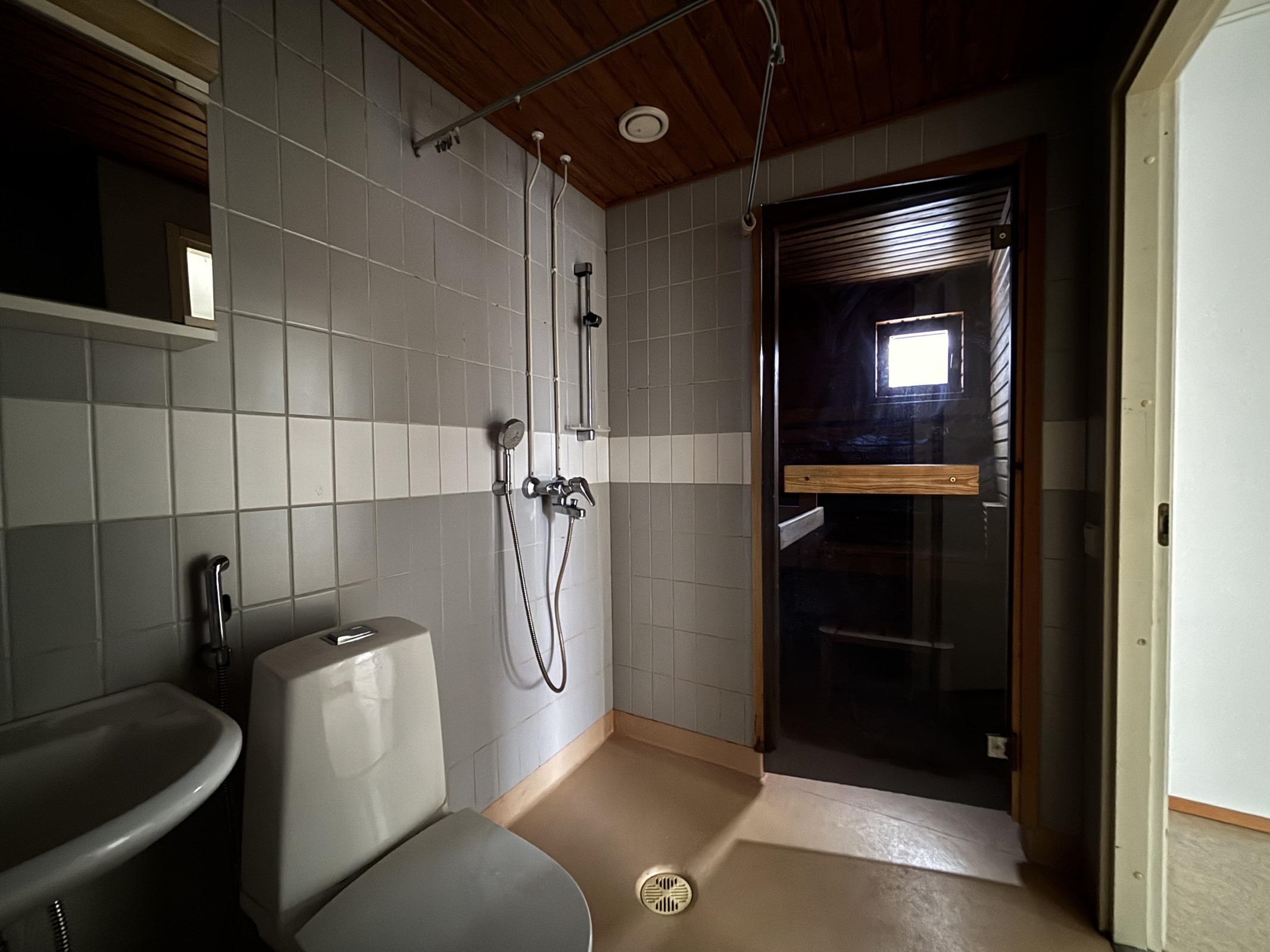 - Sauna, sähkökiuas, kylpyhuone, suihku, peilikaappi, pesukoneliitäntä, kiinteät valaisimet.