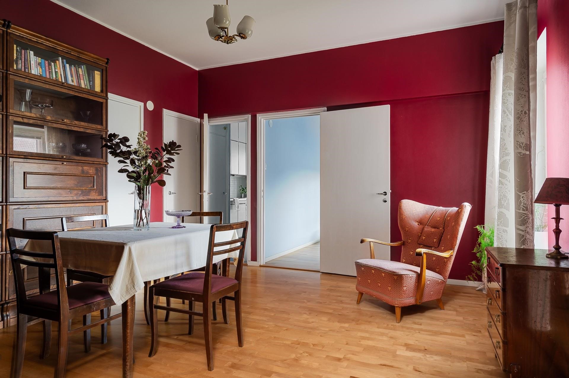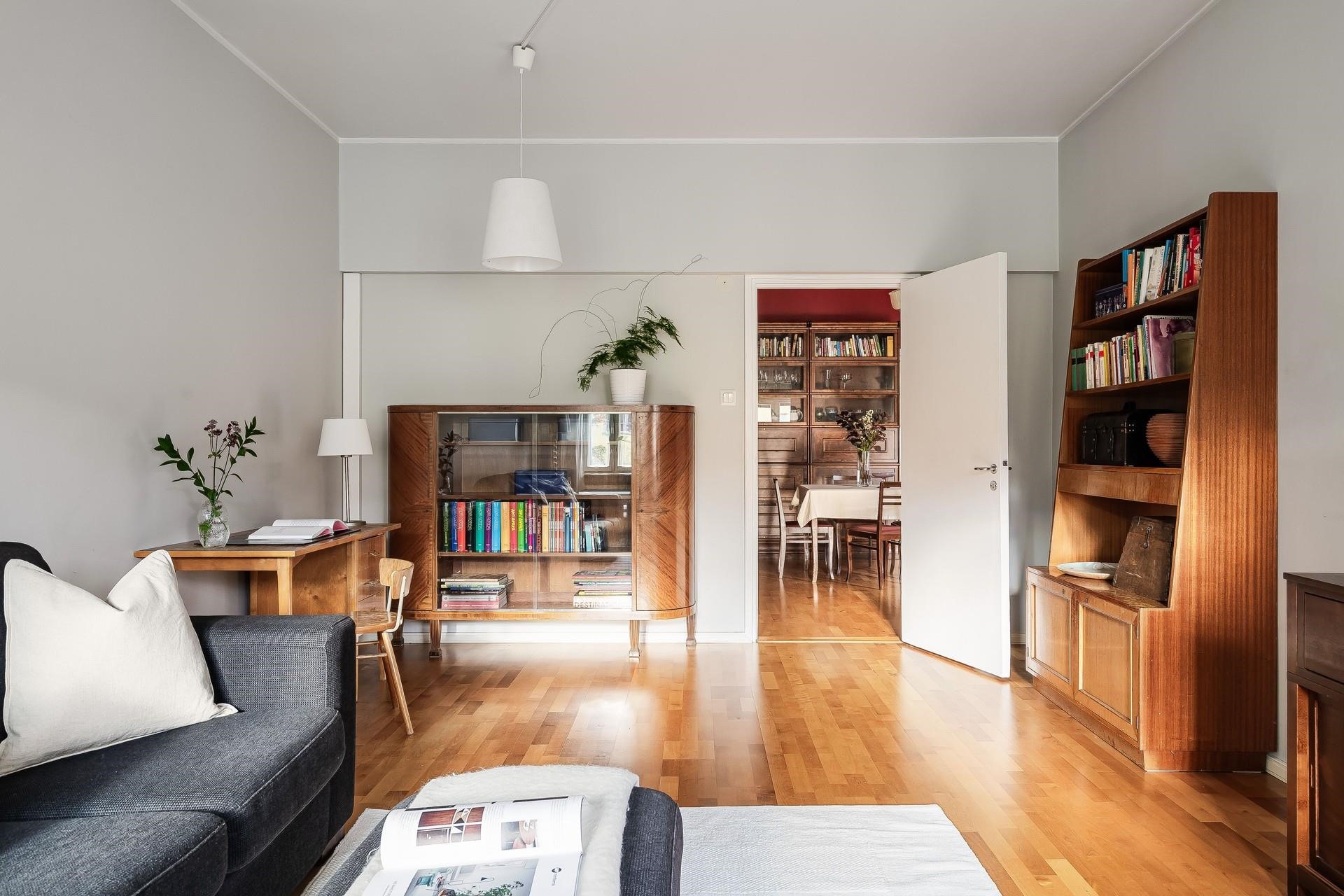 Tämä koti on remontoitu ja sisustettu rakennuksen aikakautta kunnioittaen ja henkii mukavaa tunnelmaa. Tässä kodissa on runsaasti suuria ikkunoita ja parveke sisäpihalle, hiukan tavallista juhlavampi huonekorkeus sekä komeat smyygit. Asunnon pohja taipuu moneen.