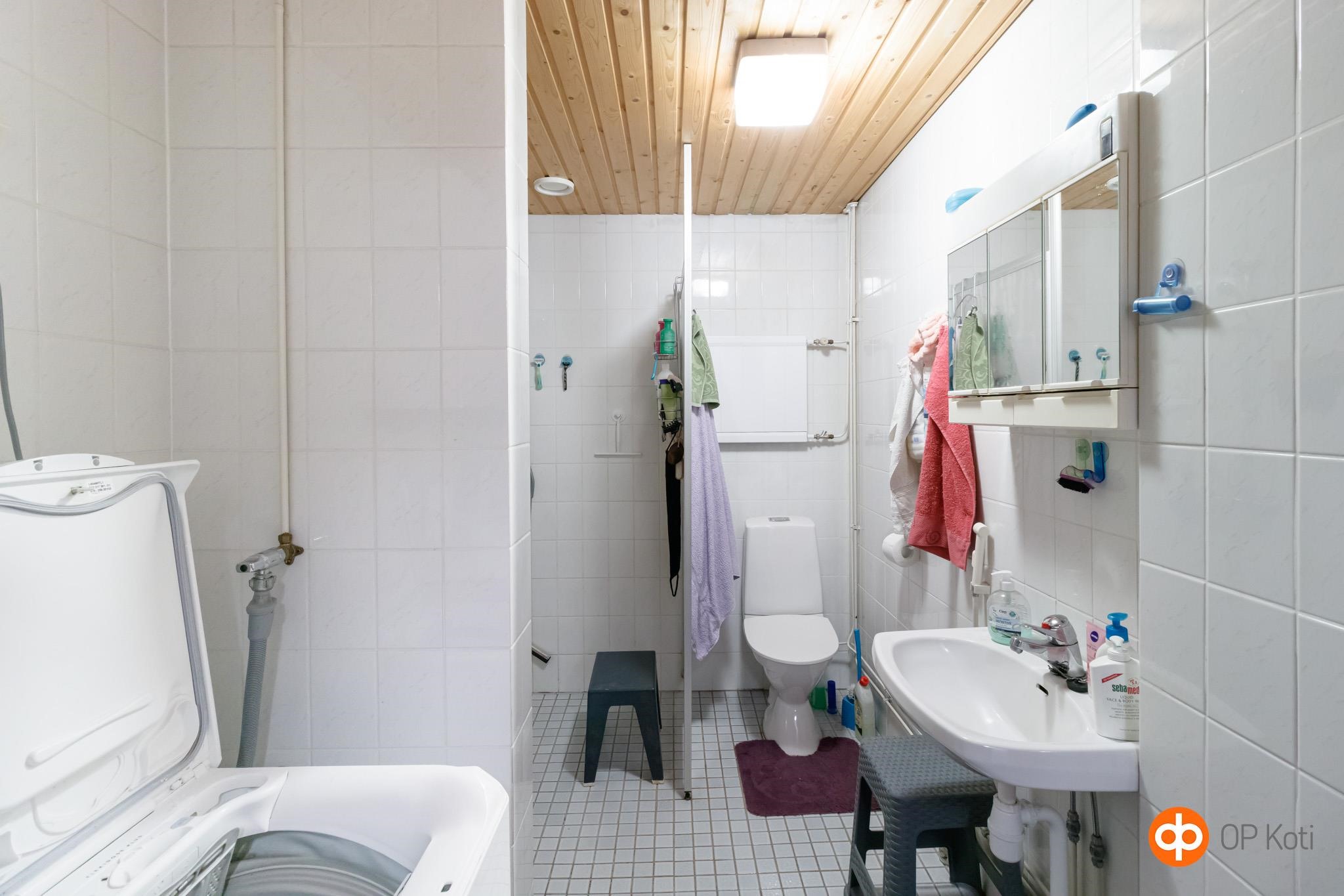 - Sauna, sähkökiuas, kylpyhuone, suihku, suihkuseinä, peilikaappi, pesukoneliitäntä, kiinteät valaisimet.