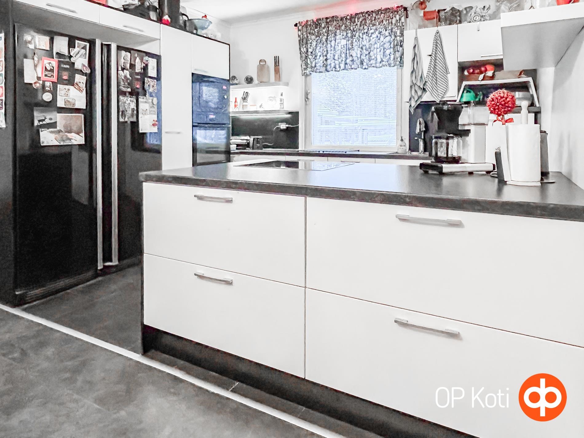 - Jääkaappi, pakastekaappi, induktioliesi, leivinuuni, astianpesukone, kaapistot.