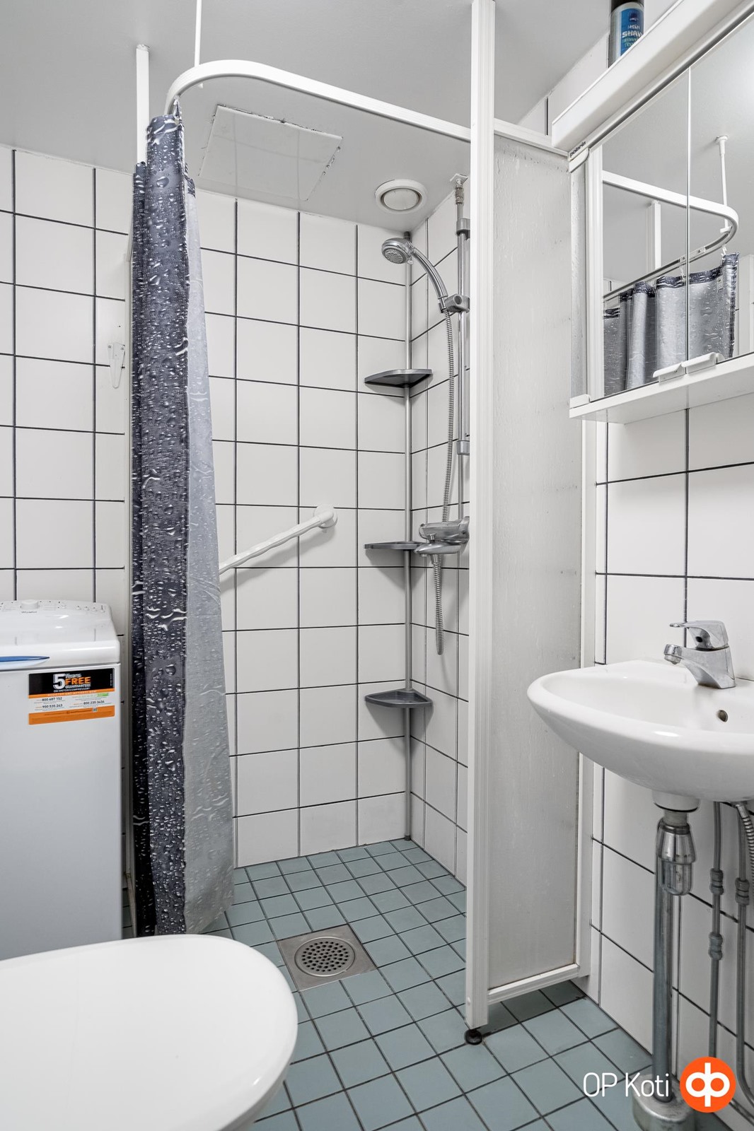 - Kylpyhuone, suihku, suihkuseinä, peilikaappi, pesukoneliitäntä, lattialämmitys, kiinteät valaisimet.