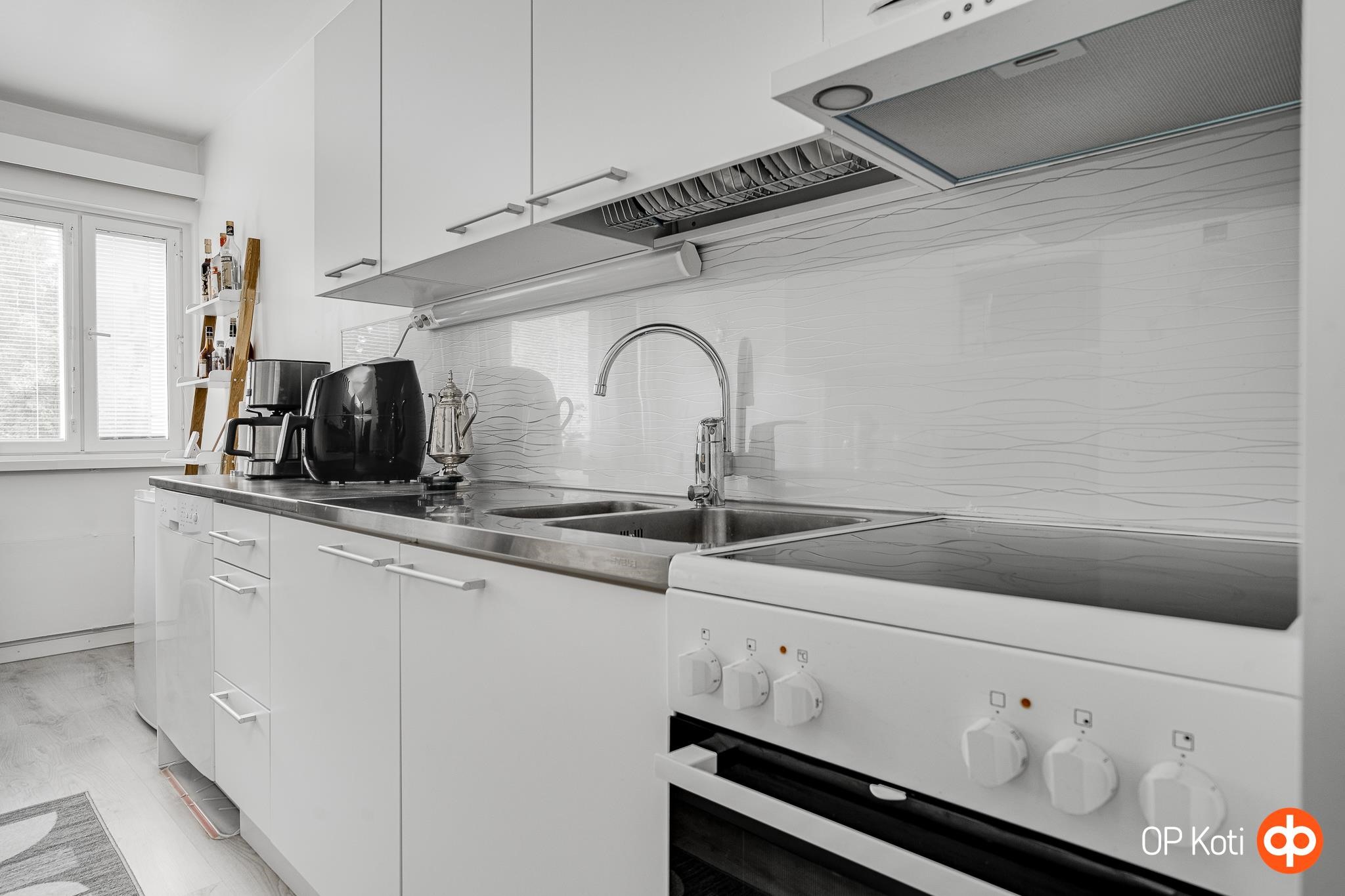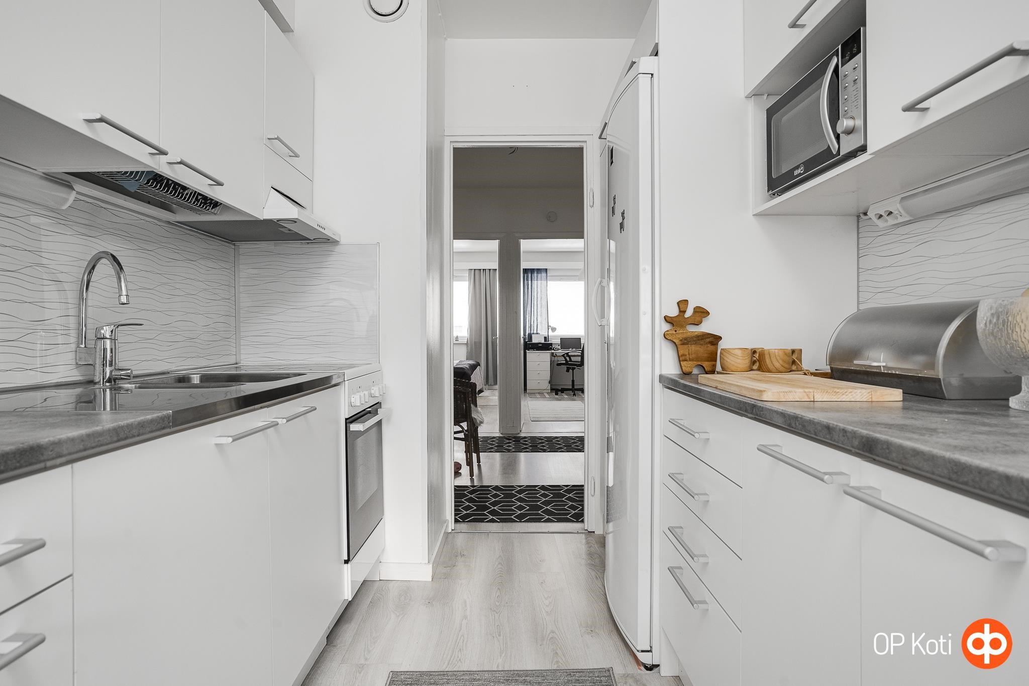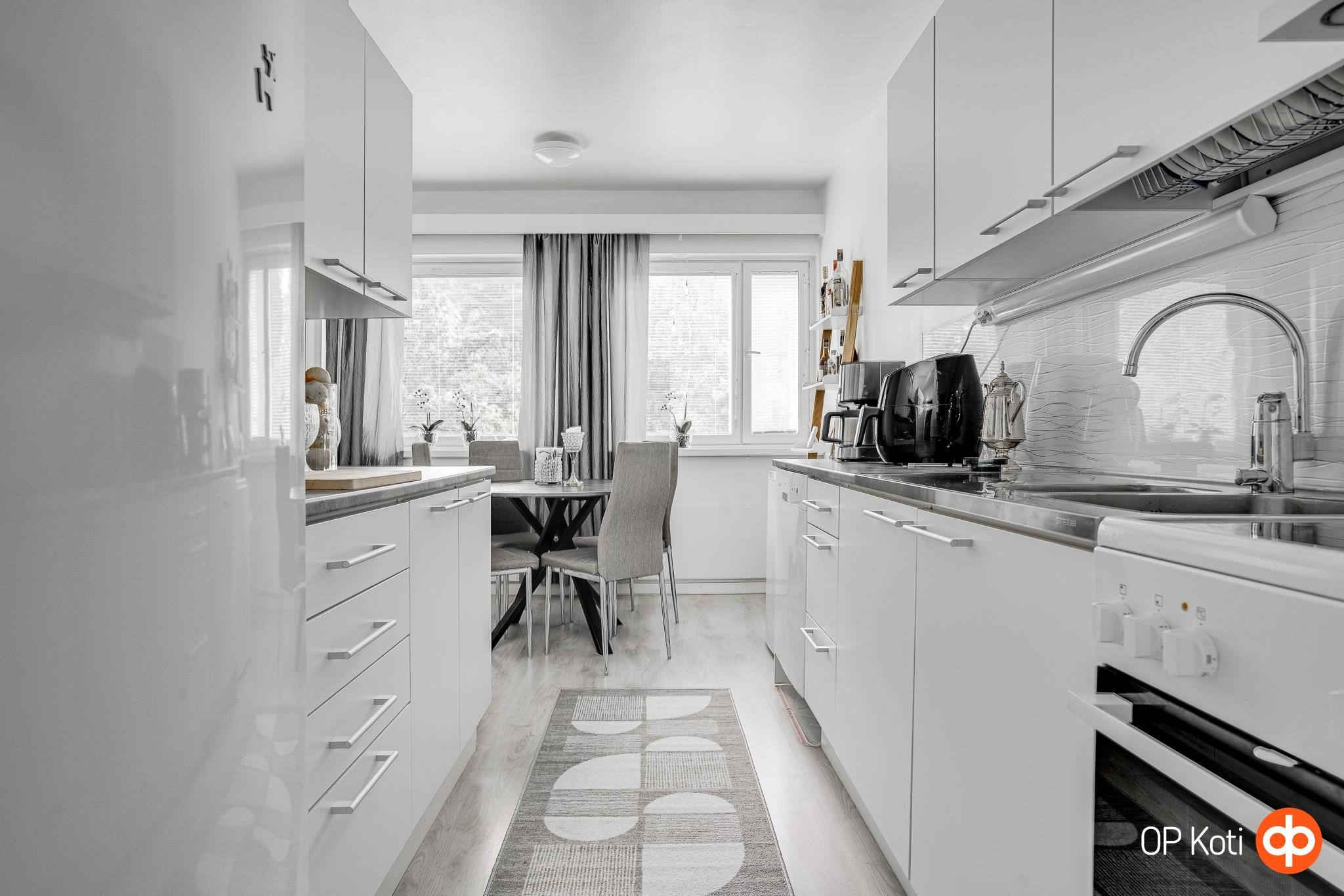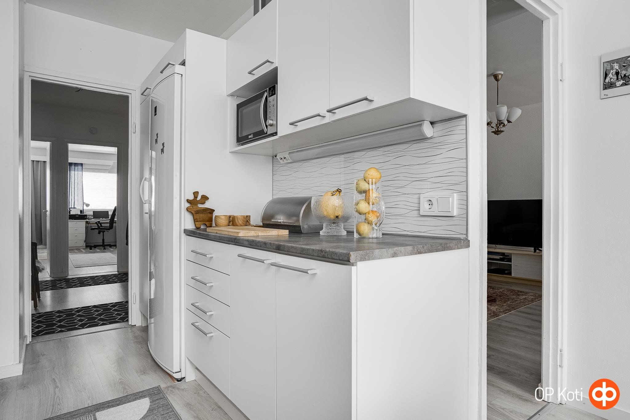 - Jääkaappi, keraaminen liesi, liesituuletin, astianpesukone, kaapistot valkeat sileäpintaiset mdf-ovet, kiinteät valaisimet.