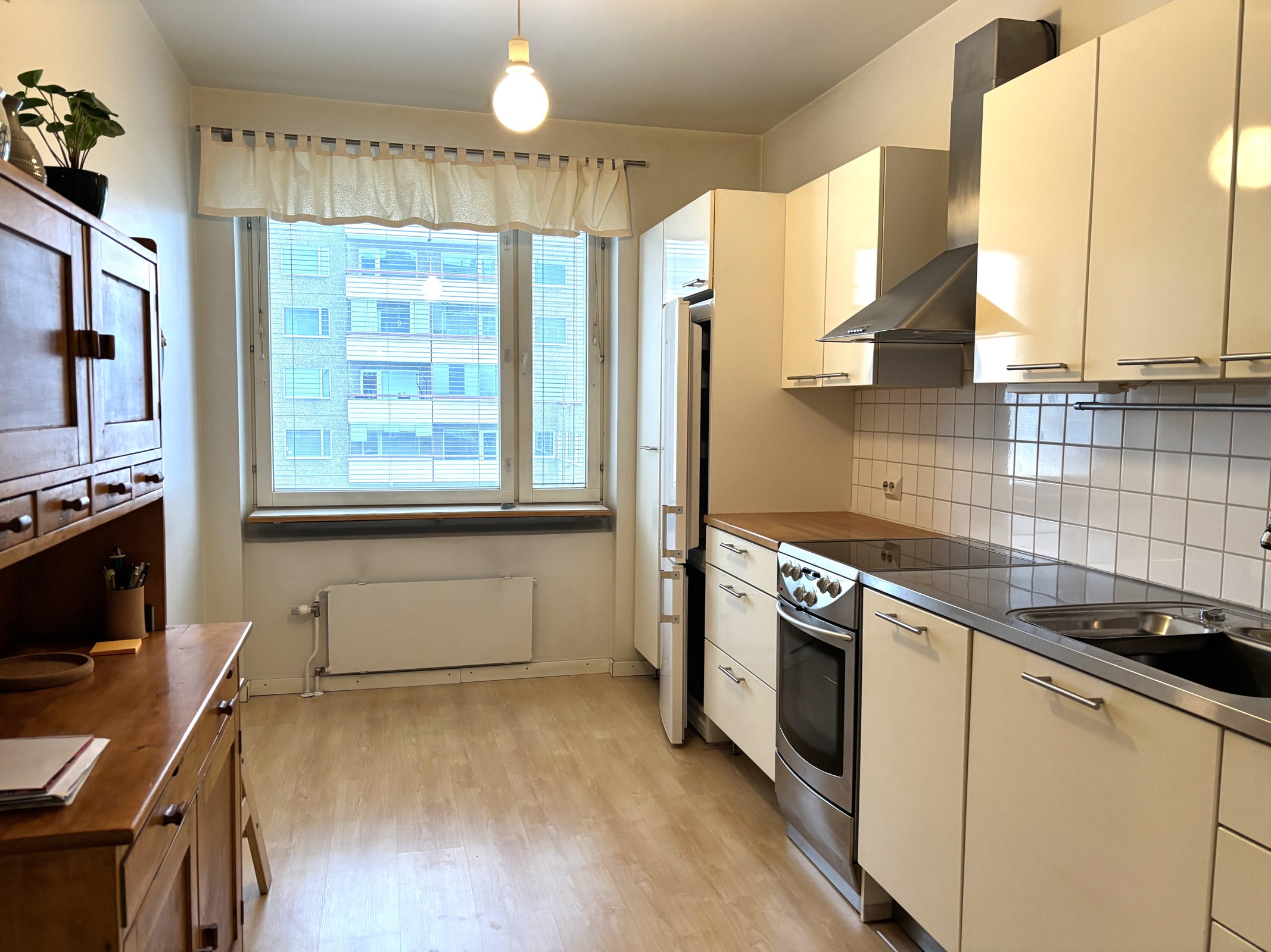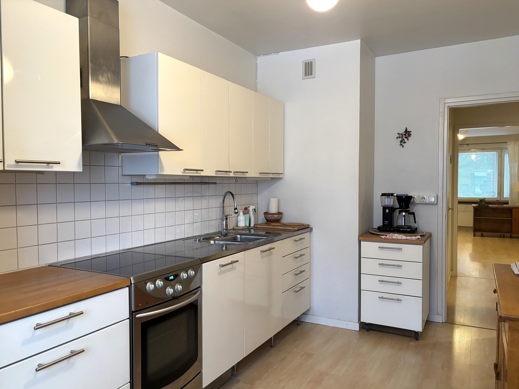 - Jääkaappipakastin, keraaminen liesi, liesituuletin suodattimella oleva, astianpesukone, kaapistot. Tilava keittiö