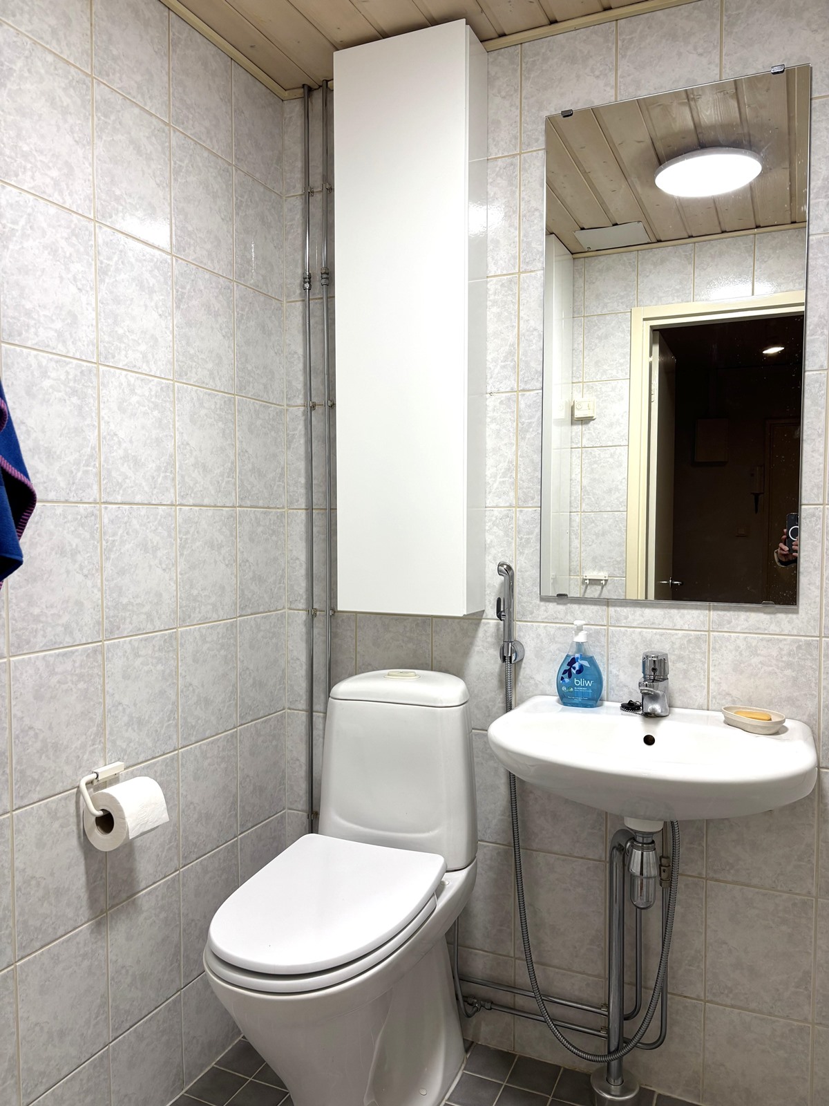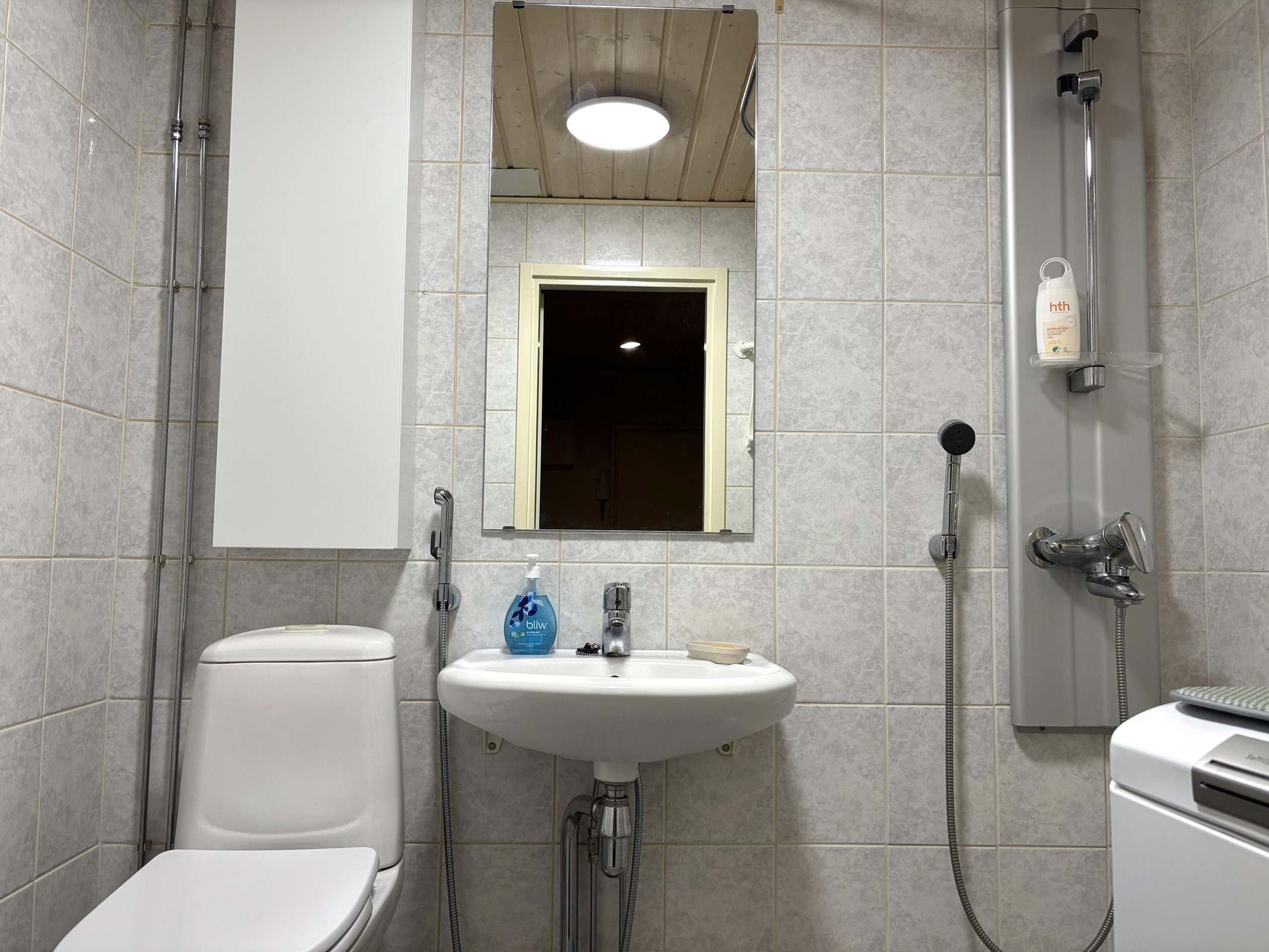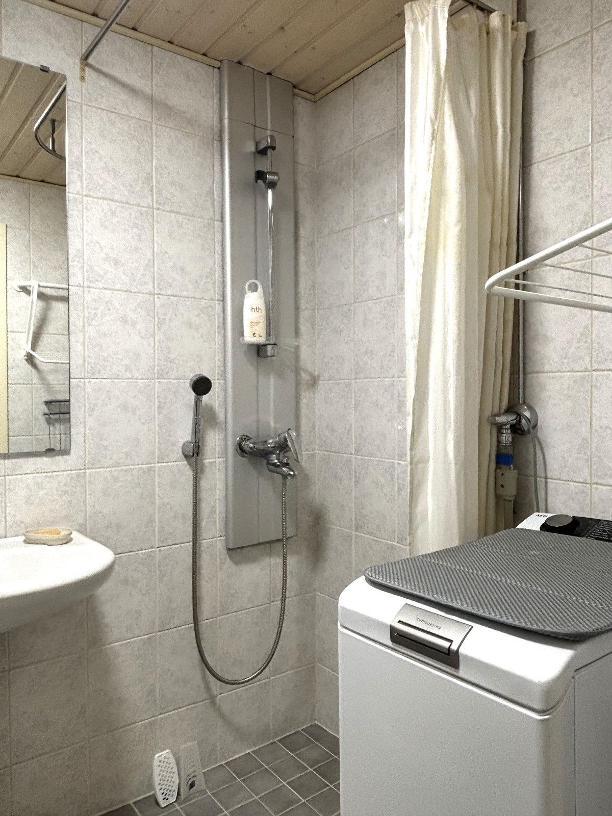 - Suihku, peilit, kaapit, pesukoneliitäntä, lattialämmitys kulutus huoneiston sähkömittariin. Kylpyhuone kokonaan laatoitettu
