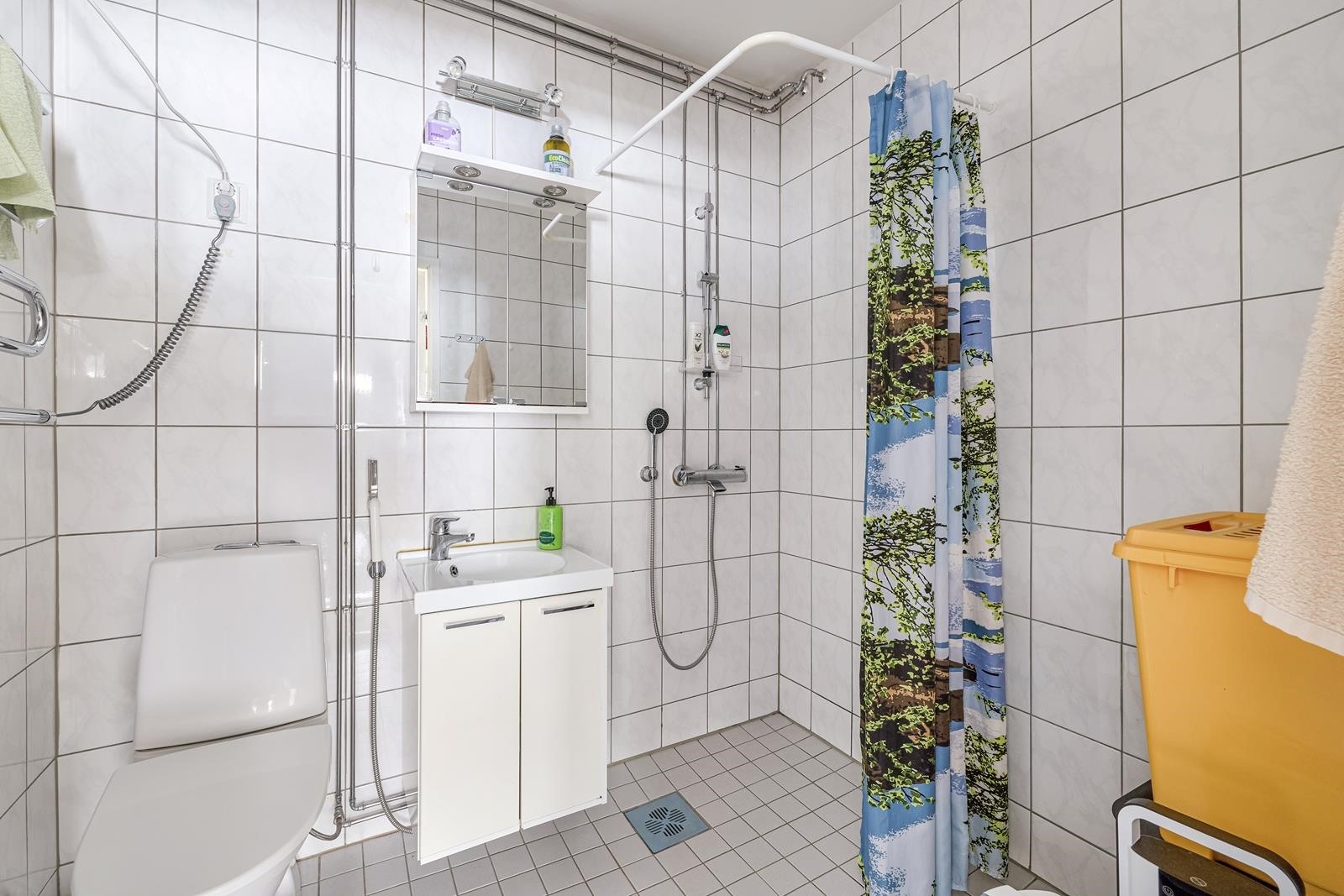 - Kylpyhuone, suihku, peilikaappi, allaskaappi, pesukoneliitäntä, pyyhekuivain.