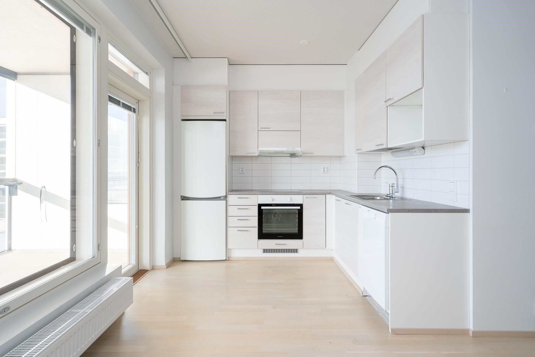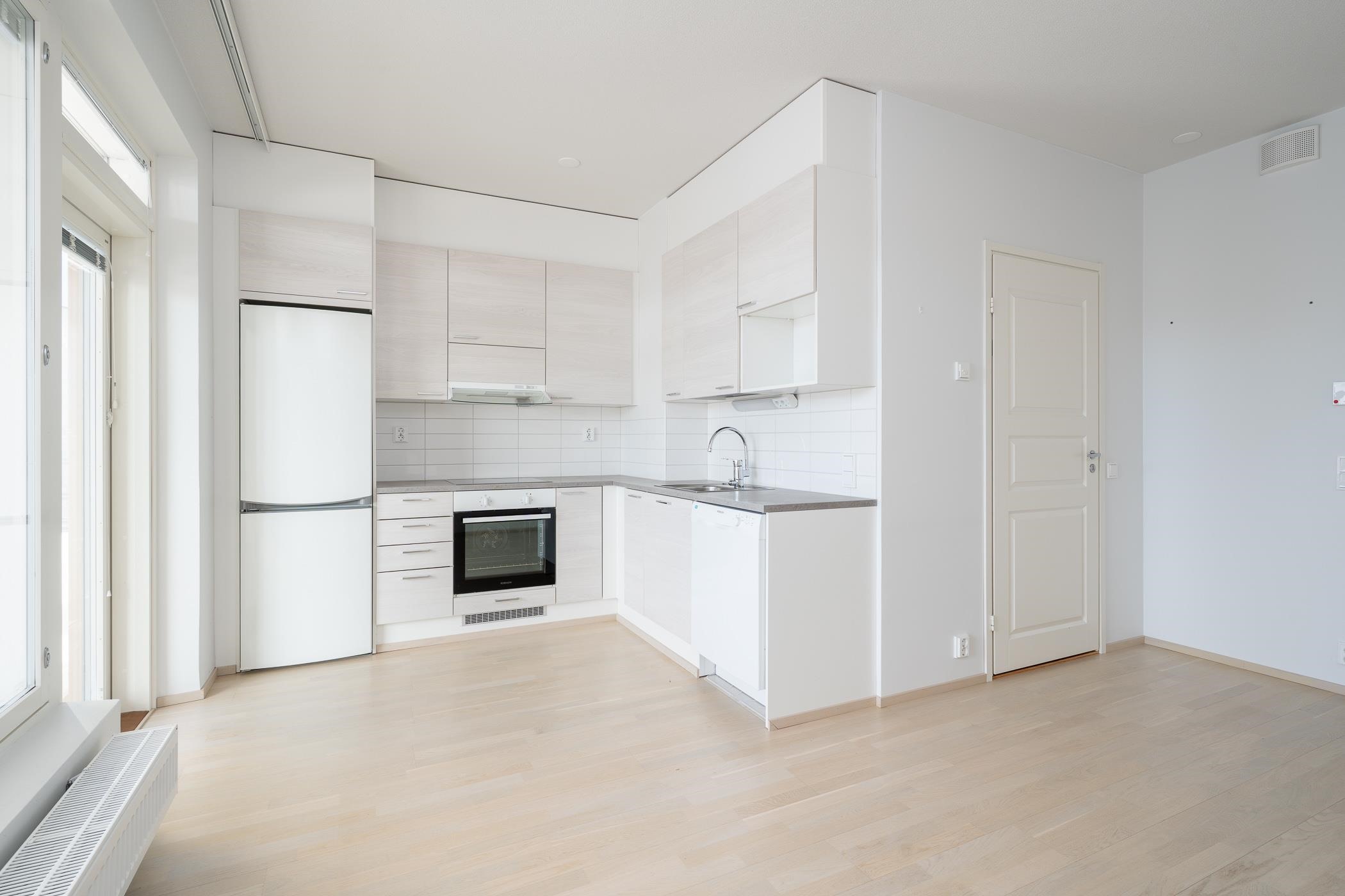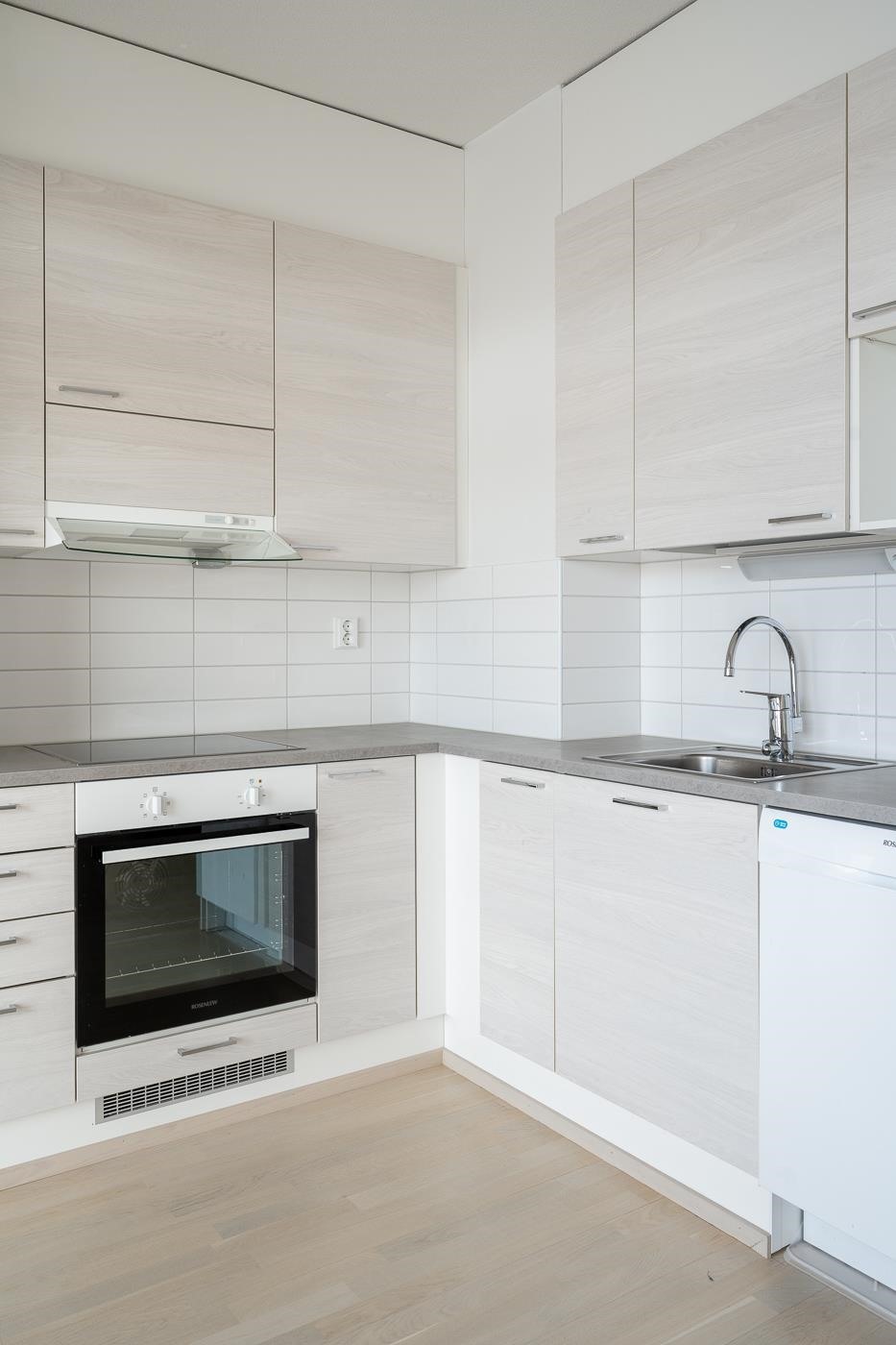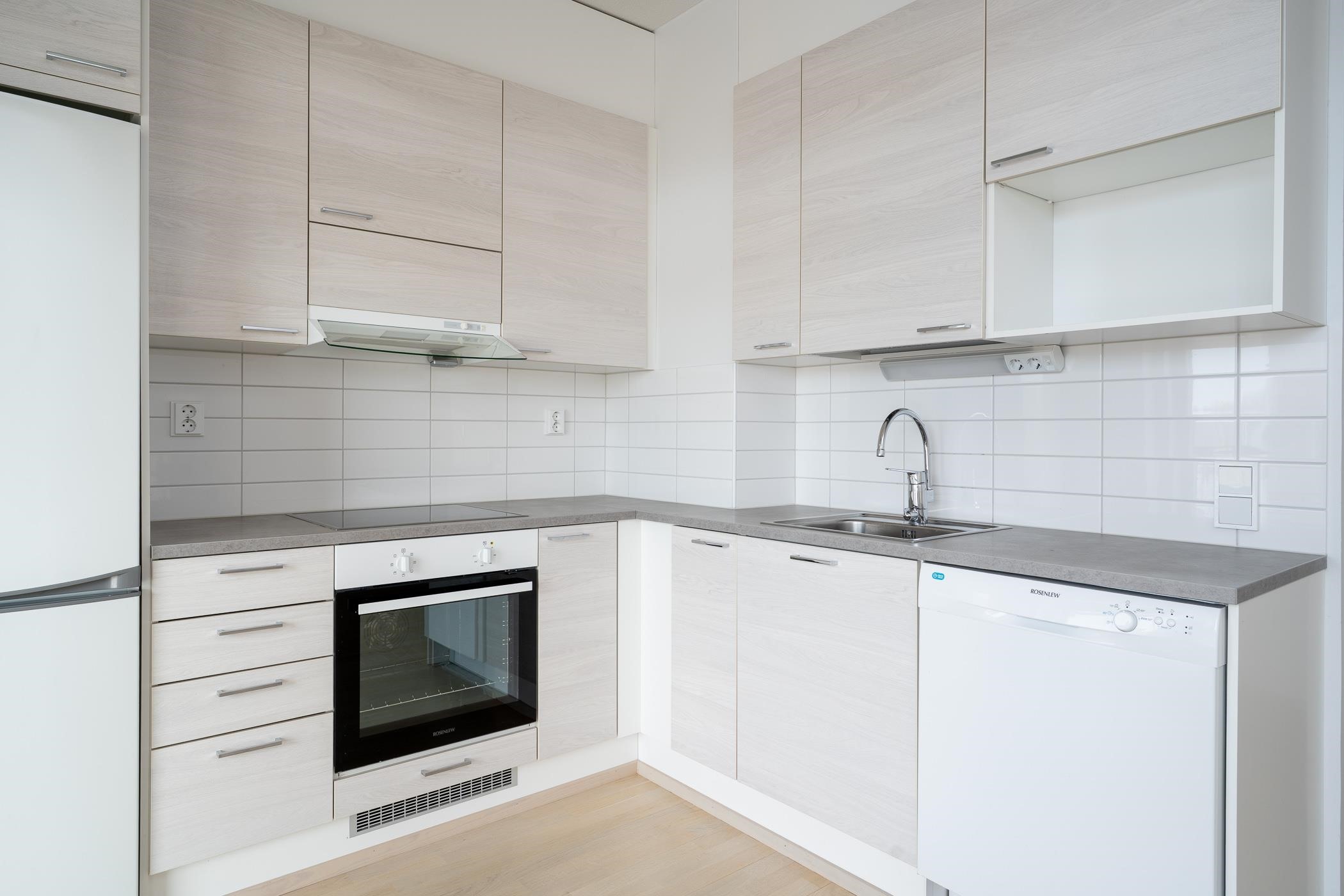 - Keittiössä : Jääkaappipakastin, integroitu erillisuuni ja liesitaso, liesikupu, astianpesukone ja kiinteät valaisimet.