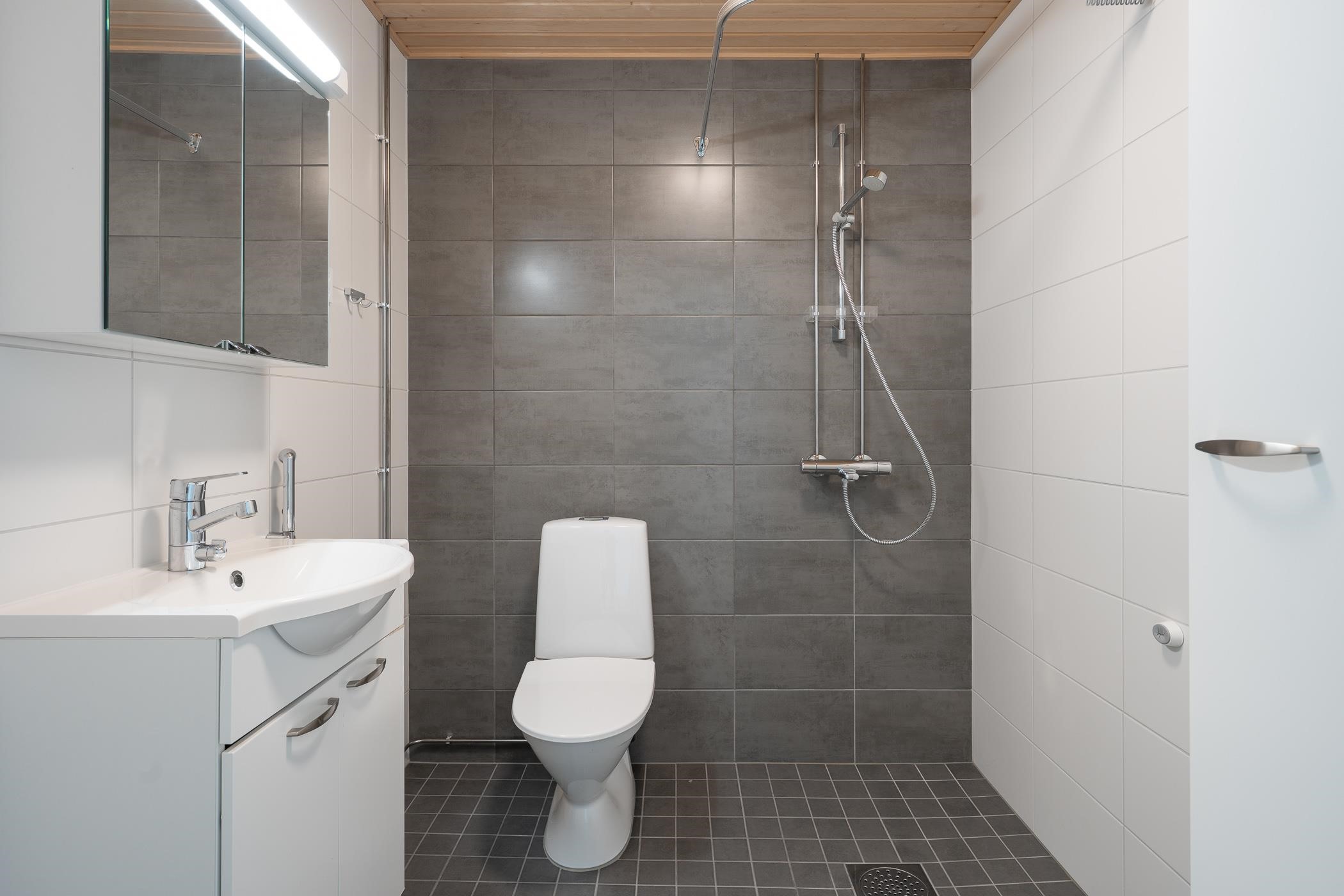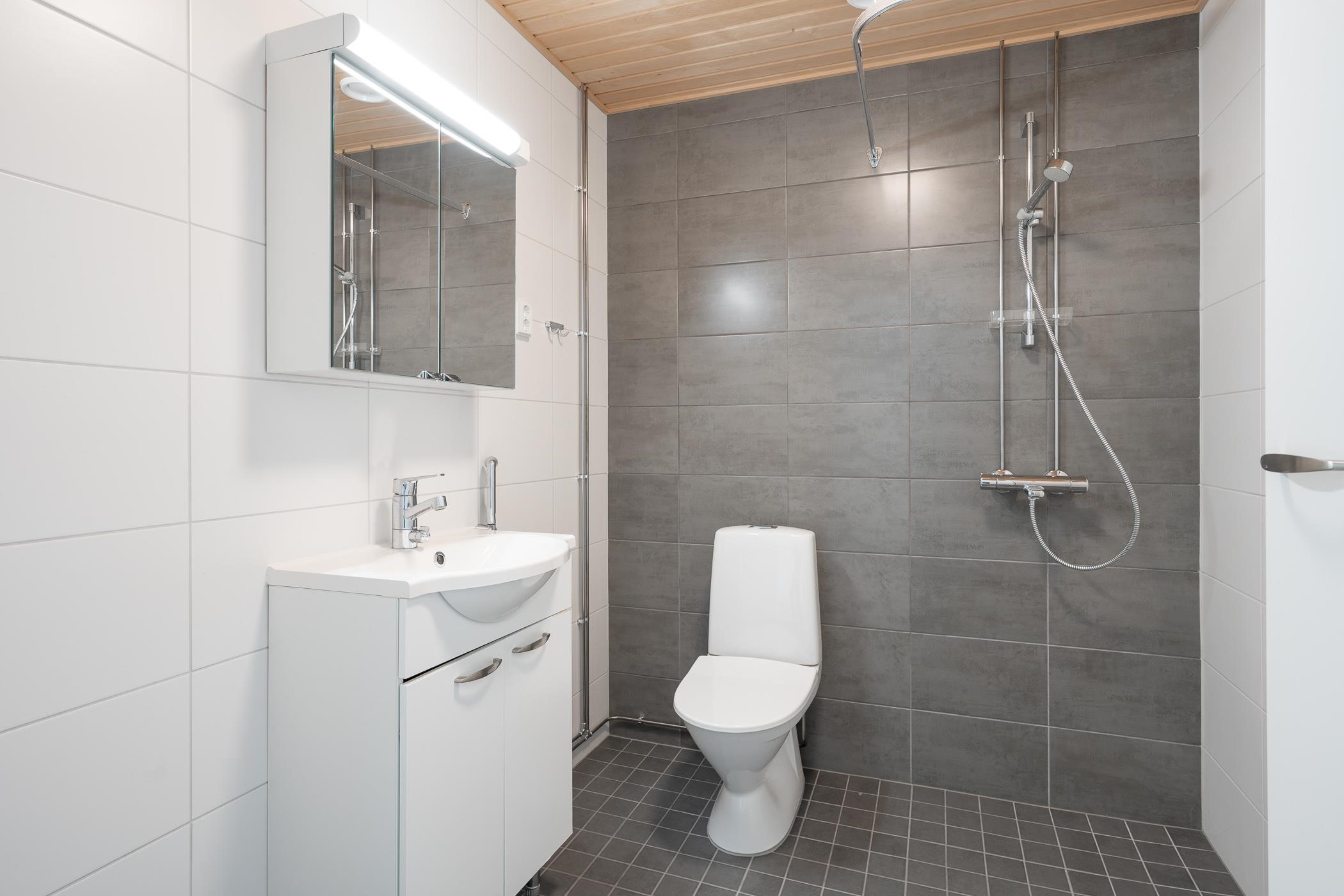 - Kylpyhuoneessa : WC, suihku, peilikaappi, kaapisto, allaskaappi, pesukoneliitäntä, lattialämmitys ja kiinteät valaisimet.