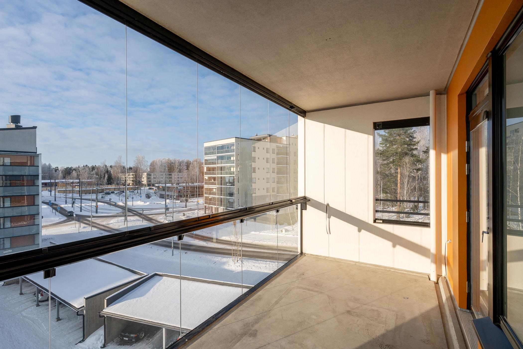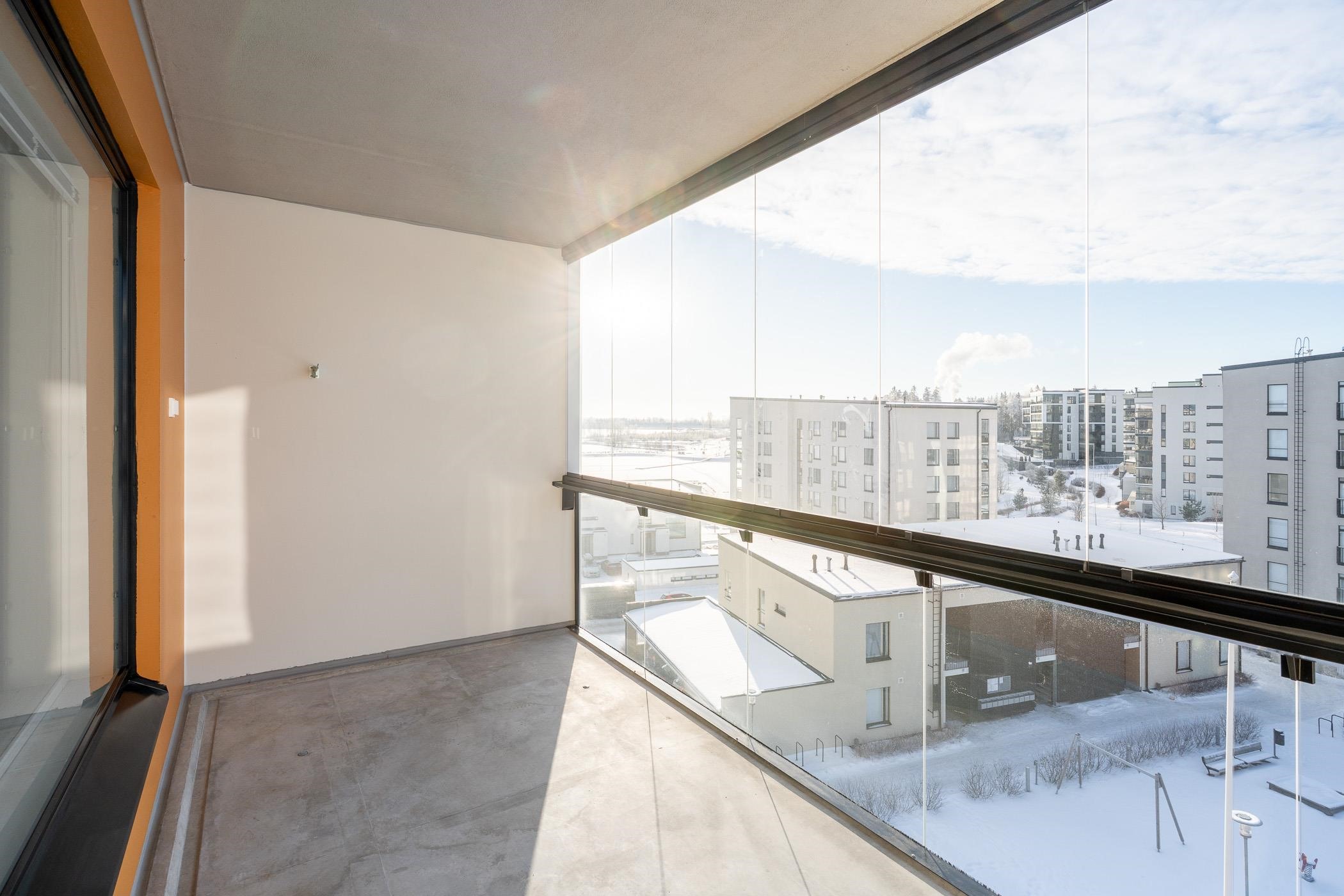 - Parvekkeelta mukavat näkymät kohti Halkoniemen satamaa ja Näsijärveä. Ilmansuunta on länteen, ja ilta-aurinko painotteinen.