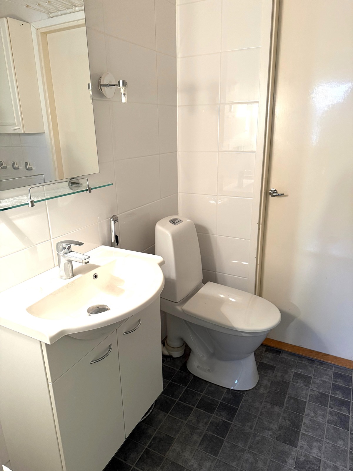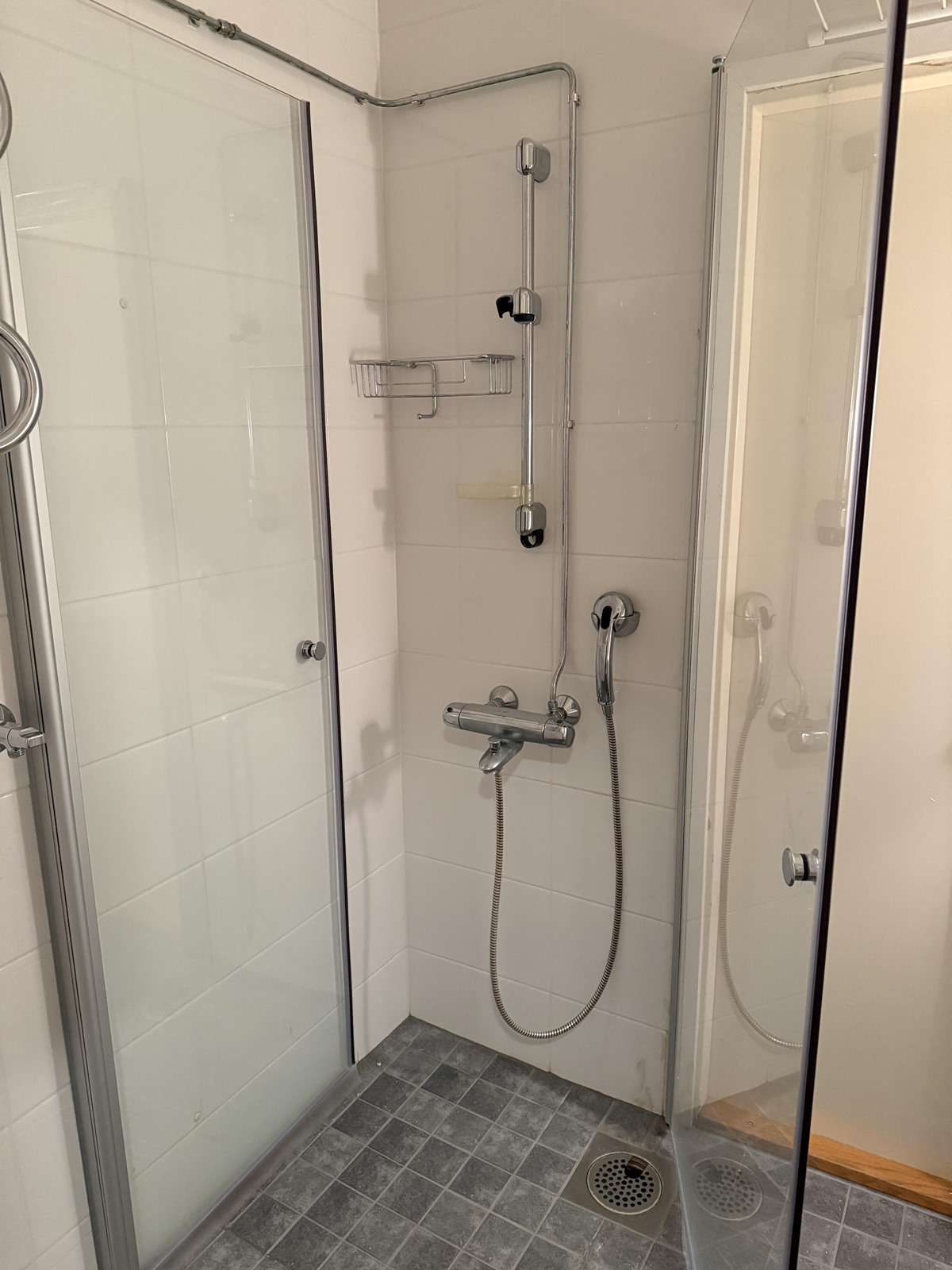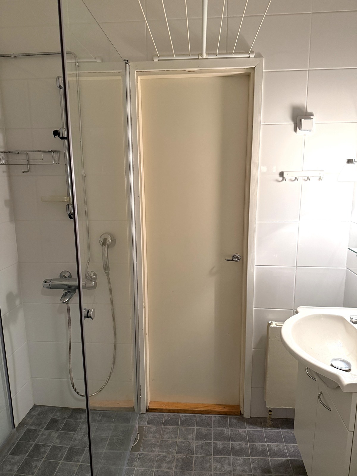- Kylpyhuone, suihkuseinä, kiinteät valaisimet.