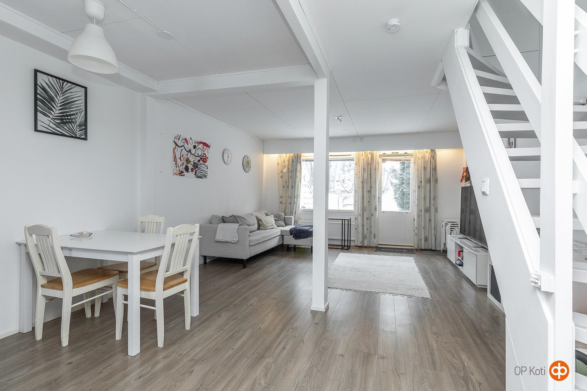 ASUNTO Hyvä asunto pariskunnalle tai pienelle perheelle 2-tasoratkaisulla. Alakerrassa keittiö ja reilunkokoinen olohuone. Olohuoneesta käynti isolle takapihalle. Makuuhuoneet ovat yläkerrassa, samoin remontoidut pesutilat. Suuri 26 huoneiston yhtiö, jossa on mukavan alhainen yhtiövastike, vain 209,25 € / kk.