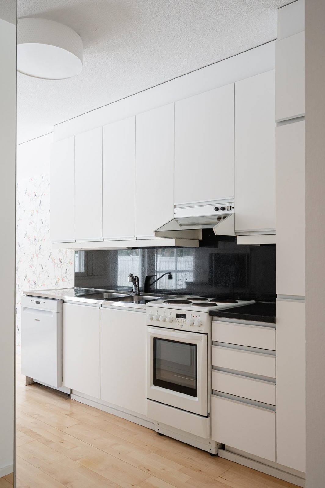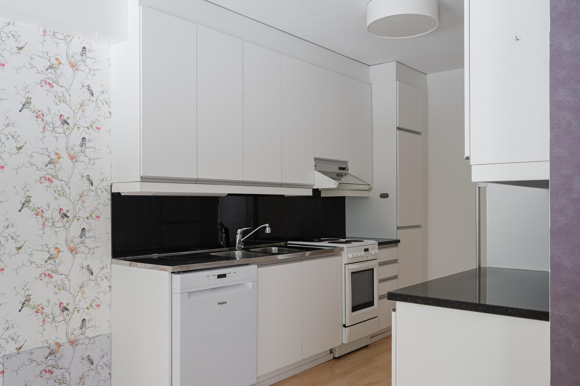 - Jääkaappipakastin, lattialiesi, liesituuletin, astianpesukone. Liesituuletin on alkuperäinen, kuuluu yhtiön vastuulle