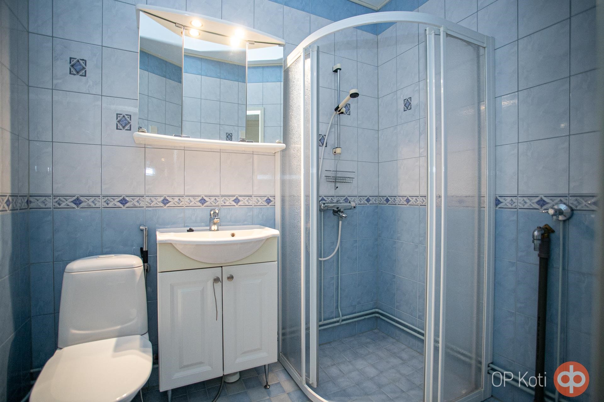 - Kylpyhuone, suihku, suihkukaappi, peilikaappi, pesukoneliitäntä, kiinteät valaisimet.