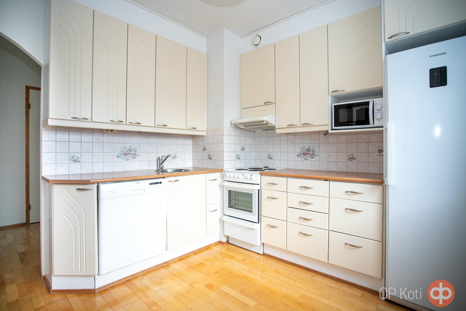 - Jääkaappi, sähköliesi, liesituuletin, mikroaaltouuni, astianpesukone, kaapistot, kiinteät valaisimet.