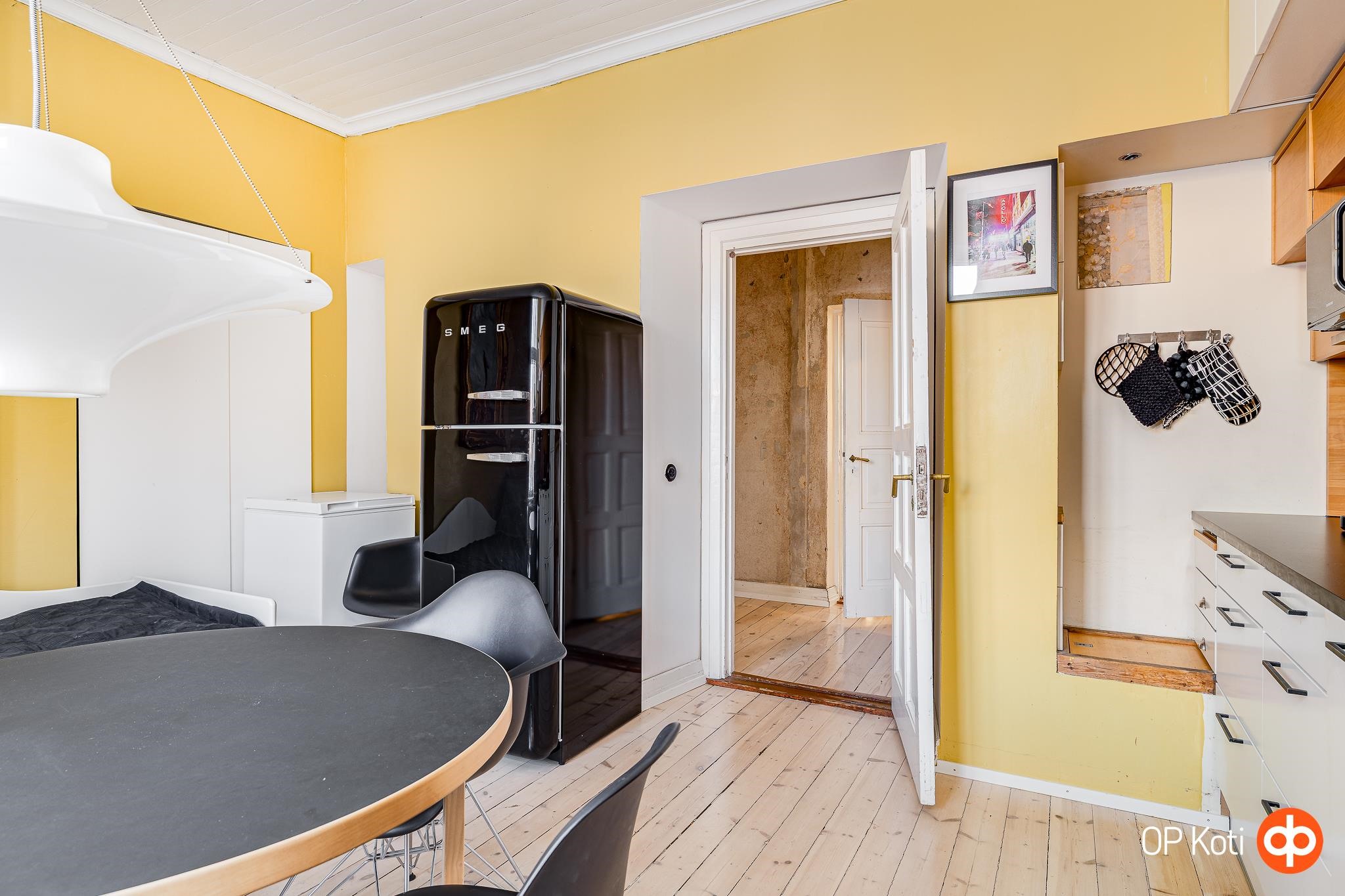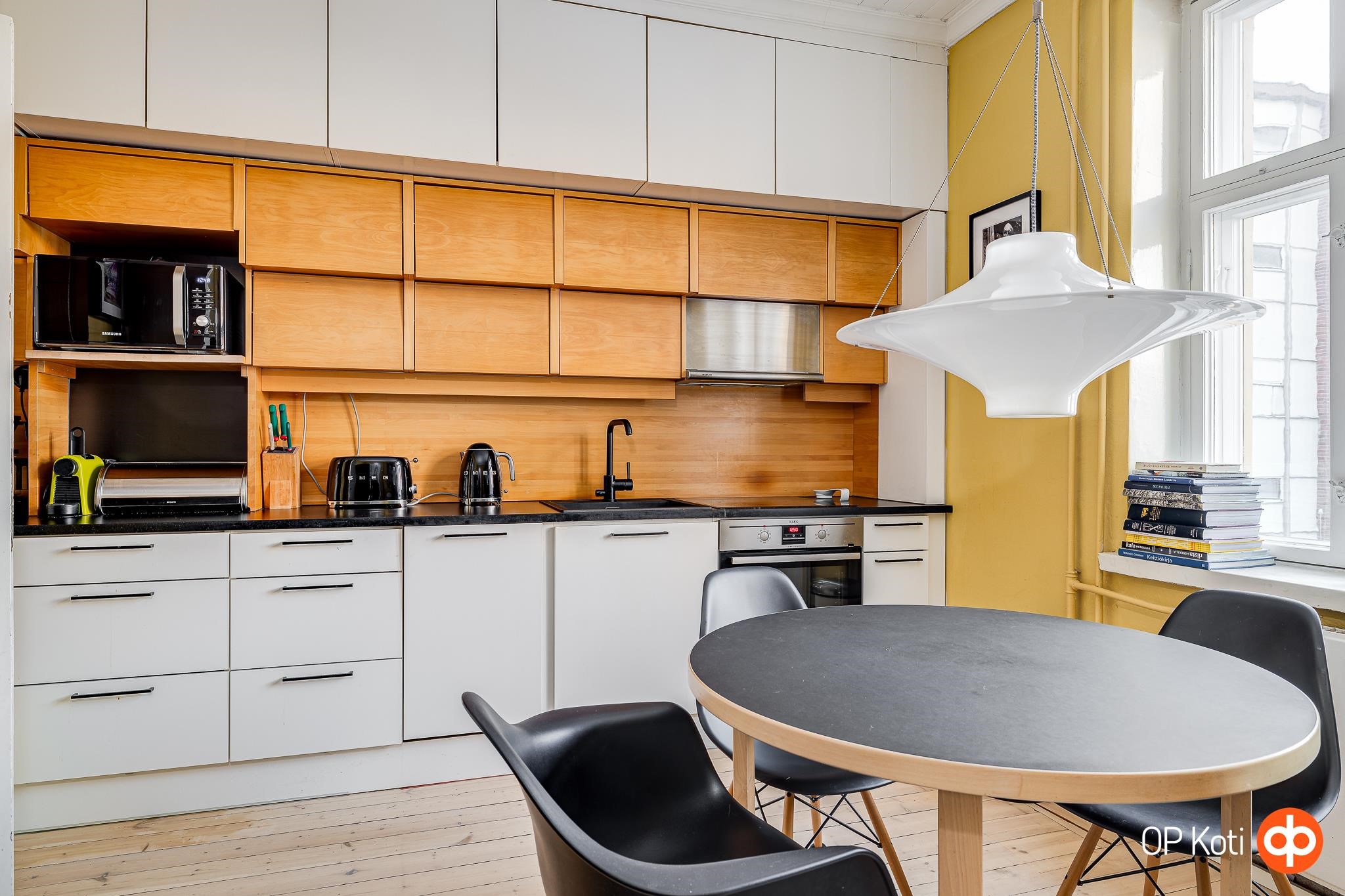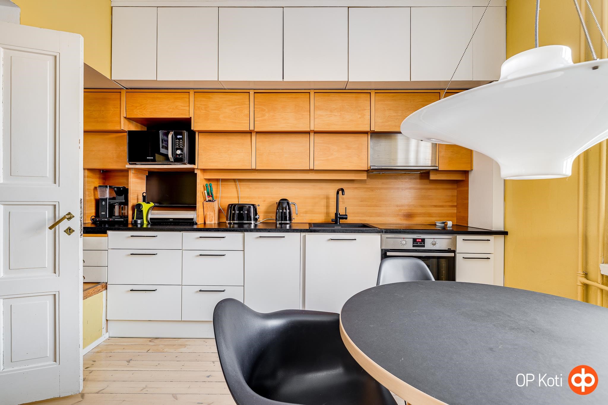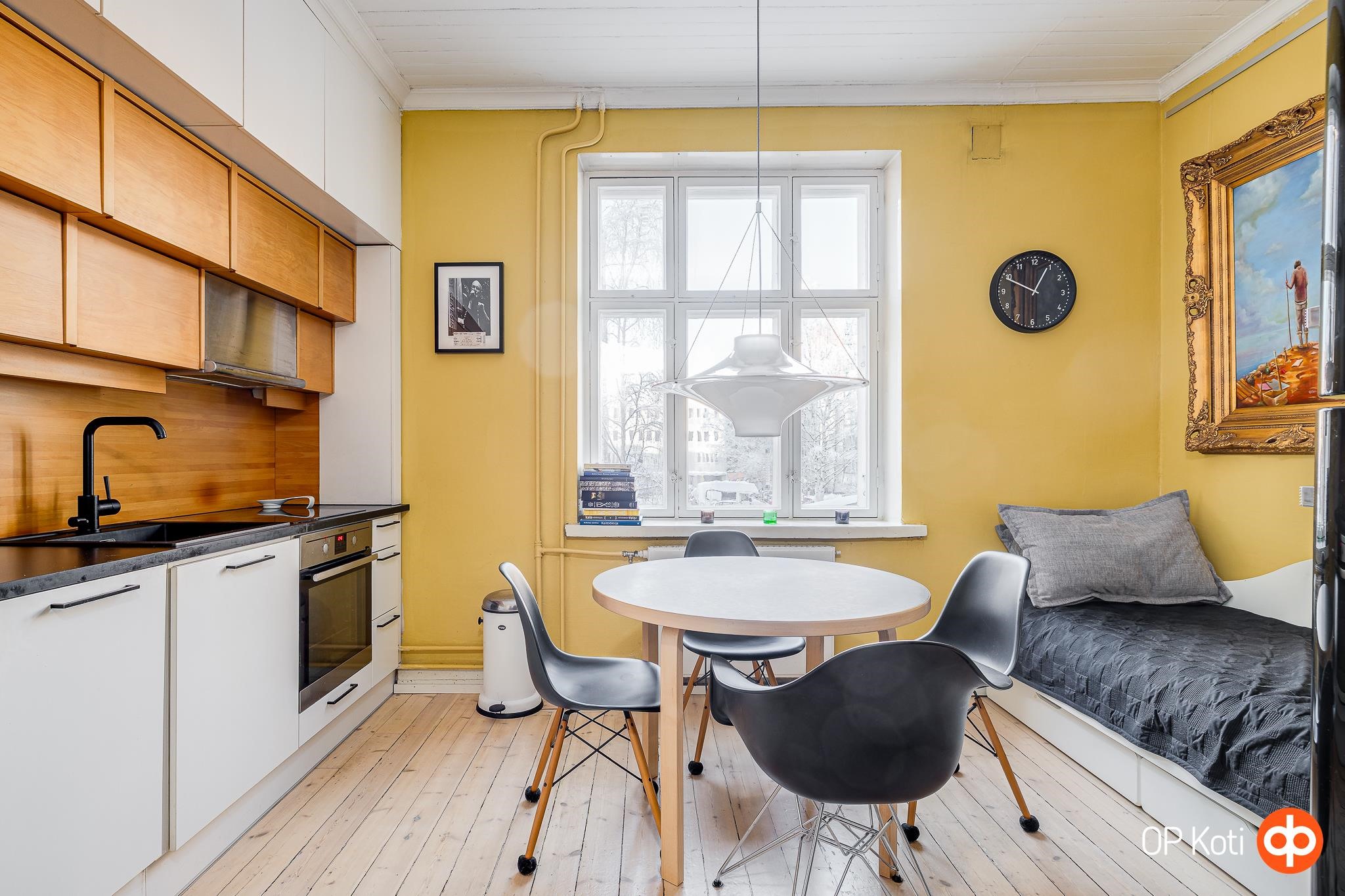 Historiallisessa miljöössä sijaitsevan huoneiston pohjaratkaisu tarjoaa selkeät ja väljät tilat. Valoisassa olohuoneessa aamuaurinko toivottaa tervetulleeksi uuteen päivään. Keittiö on nykyaikaisesti varusteltu, ja siellä on laadukas kivitaso sekä käytännölliset, uusitut alakaapit. Makuuhuoneiden ikkunat avautuvat rauhalliseen suuntaan, ja pienen makuuhuoneen puolapuut tarjoavat mahdollisuuden vaikka kotijumppaan. Säilytystilaa on runsaasti sekä asuntoon kuuluvissa komeroissa että yhtiön vintti- ja kellarivarastoissa. Tässä kodissa yhdistyvät vanhan talon arvokkuus ja tämän päivän mukavuudet sopivalla tavalla.