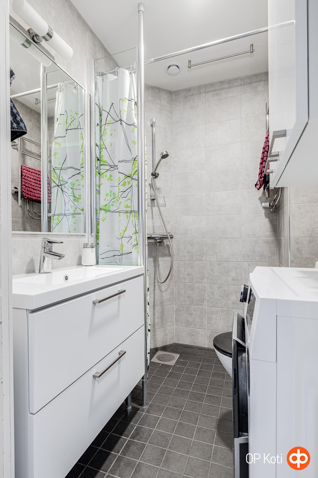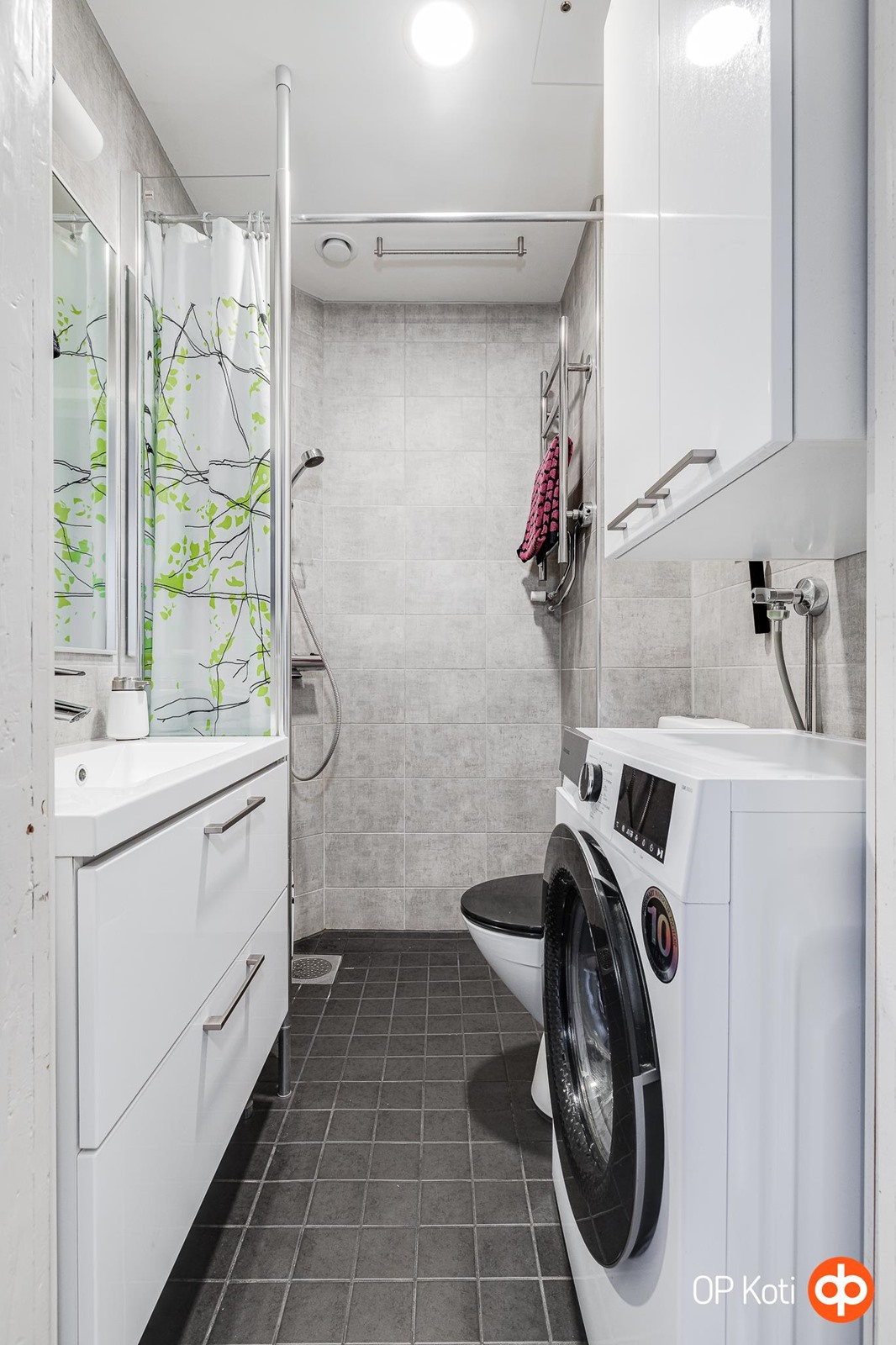 - Kylpyhuone (uusittu täysin vuonna 2016), suihku, suihkuseinä, peilikaappi, kaapit (kh:ssa kaappi), allaskaappi, pesukoneliitäntä, lattialämmitys (sähkötoiminen mukavuuslattialämmitys), kiinteät valaisimet.