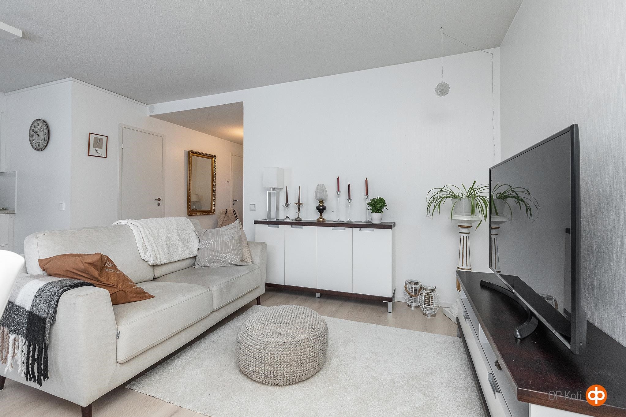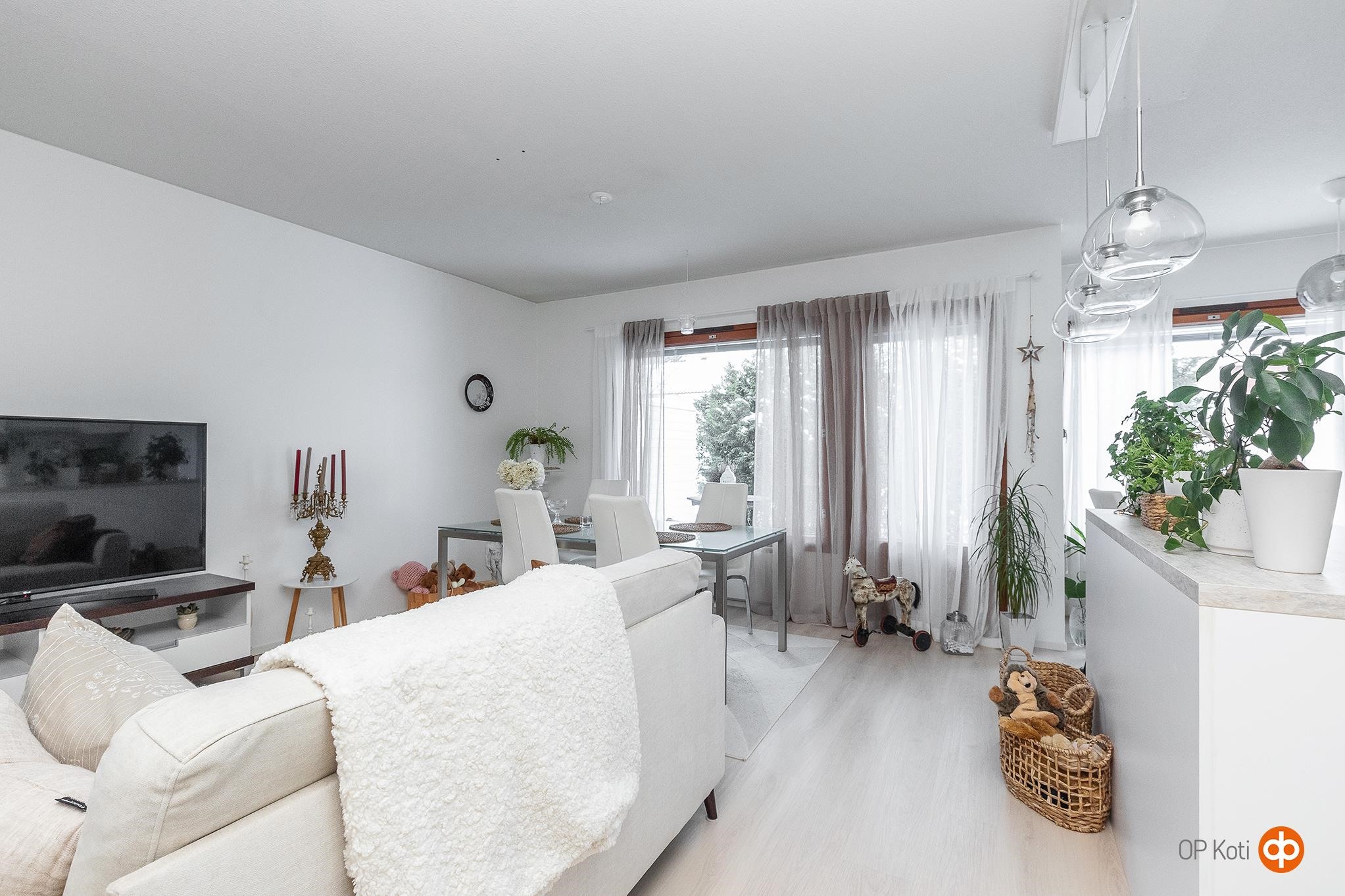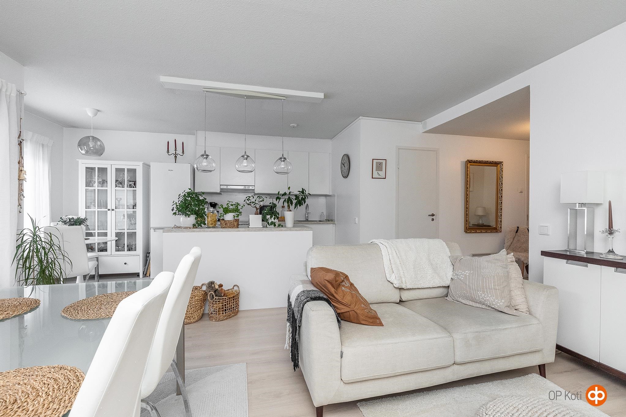 Hyvällä maulla remontoitu koti tarjoaa selkeät ja toimivat asuintilat yhdessä tasossa. Avara olohuone-keittiö muodostaa kodin sydämen, ja kiinteä saareke rytmittää tilaa sekä lisää käytännöllistä säilytystä. Vuonna 2022 uusittiin koko keittiö kodinkoneineen, olohuoneen ja eteisen lattia- ja seinäpinnat sekä makuuhuoneen pintamateriaalit. Samassa yhteydessä keittiön ja olohuoneen välinen seinä poistettiin, jolloin tilasta tuli entistä valoisampi ja avarampi.