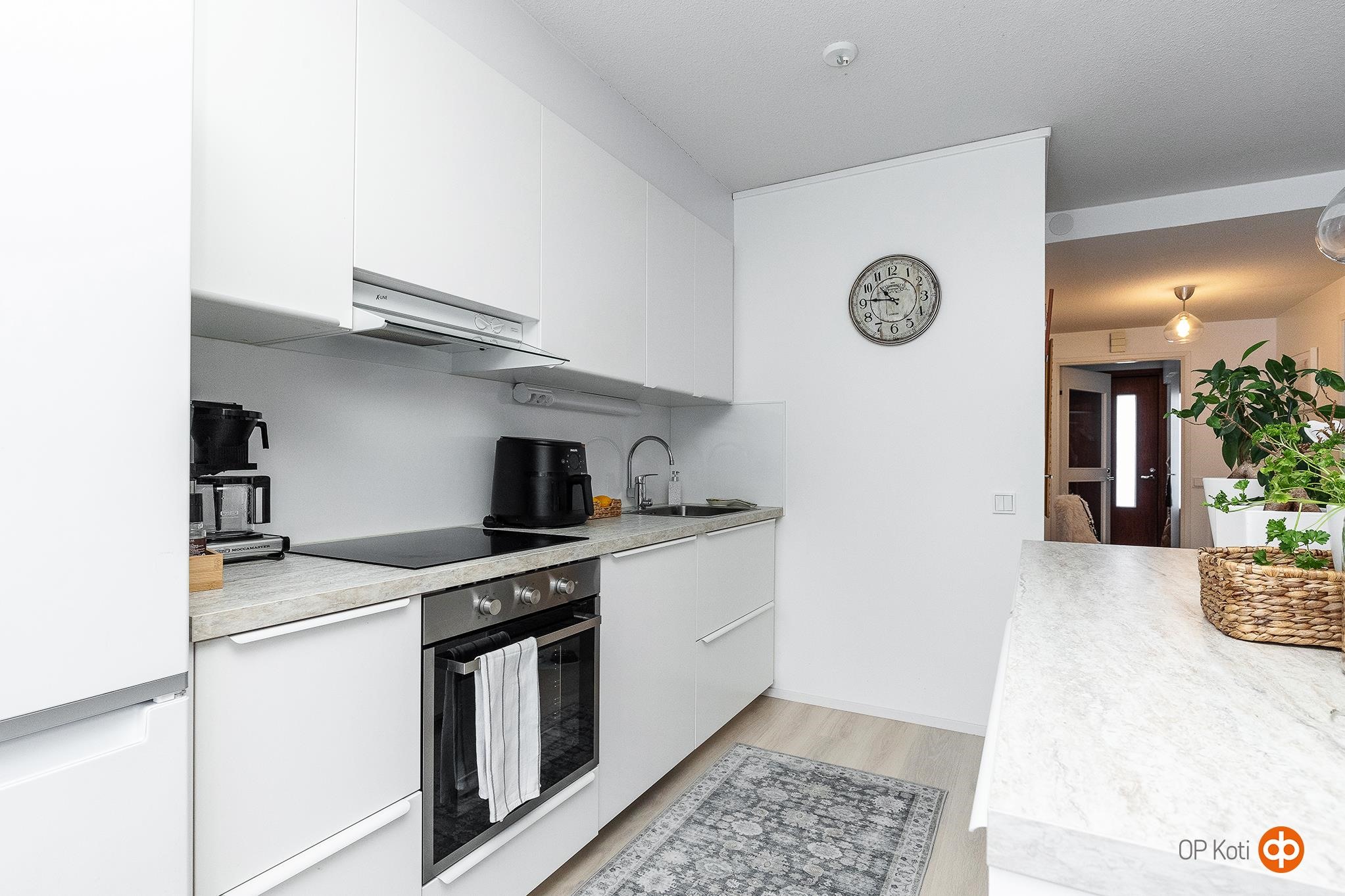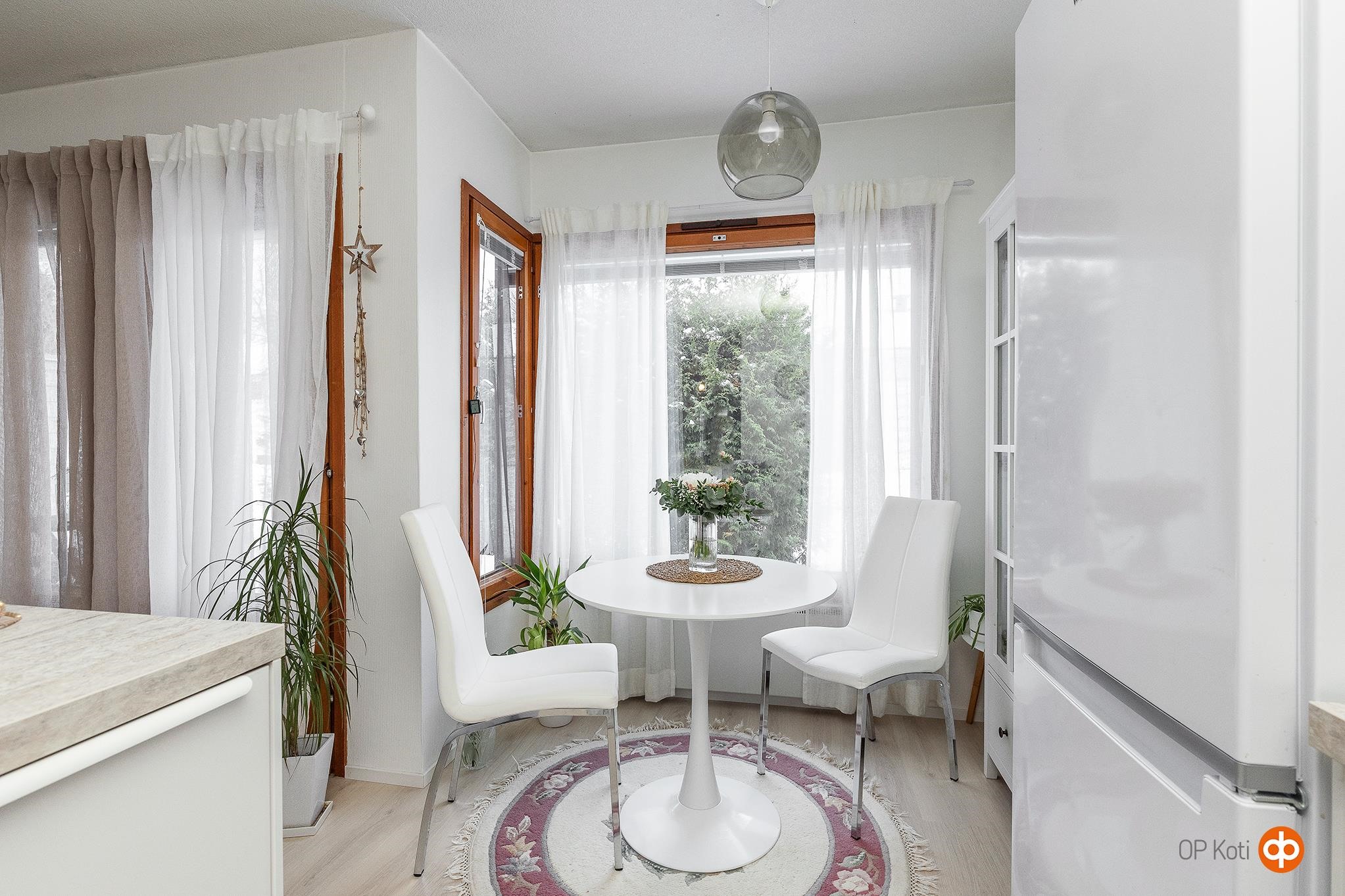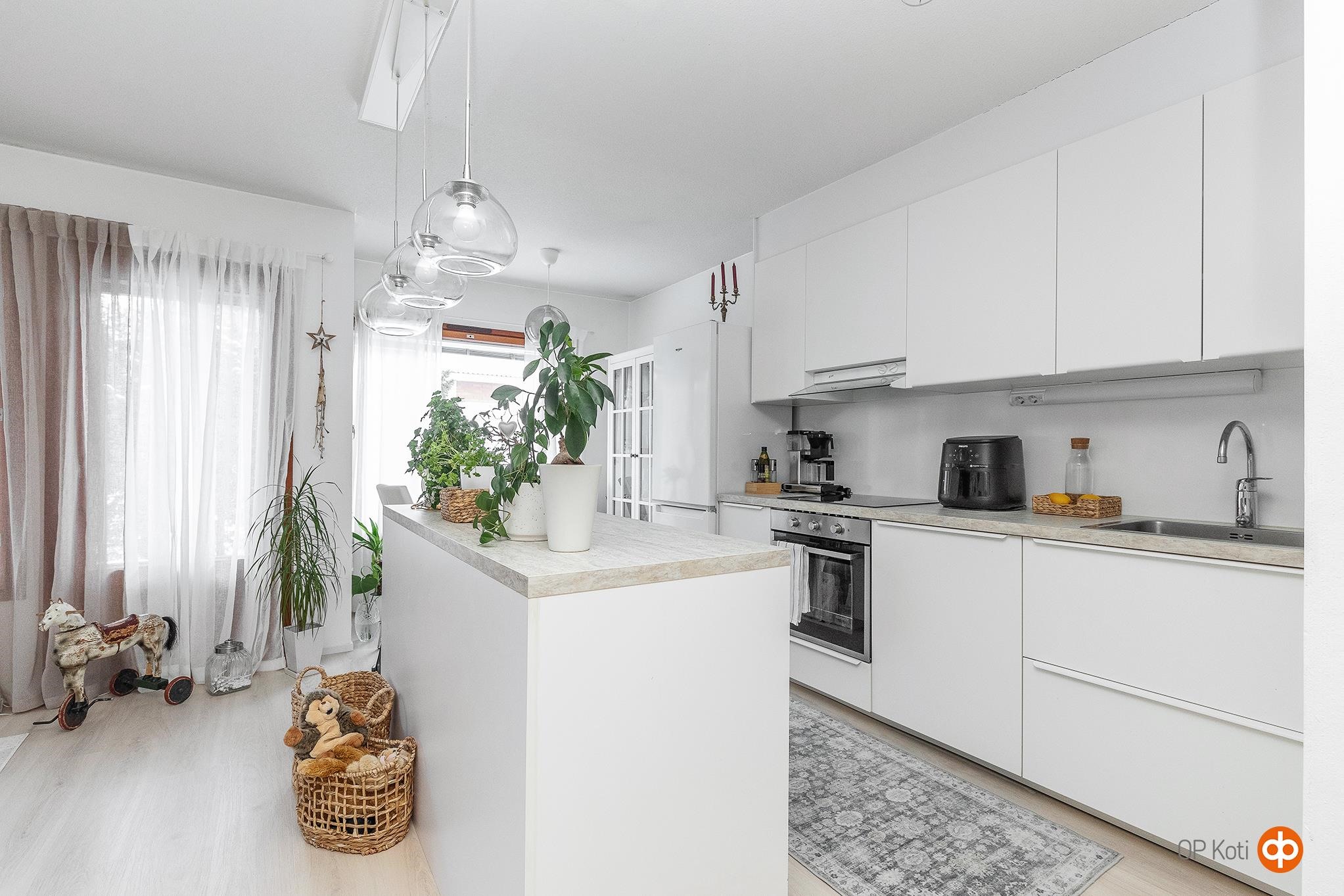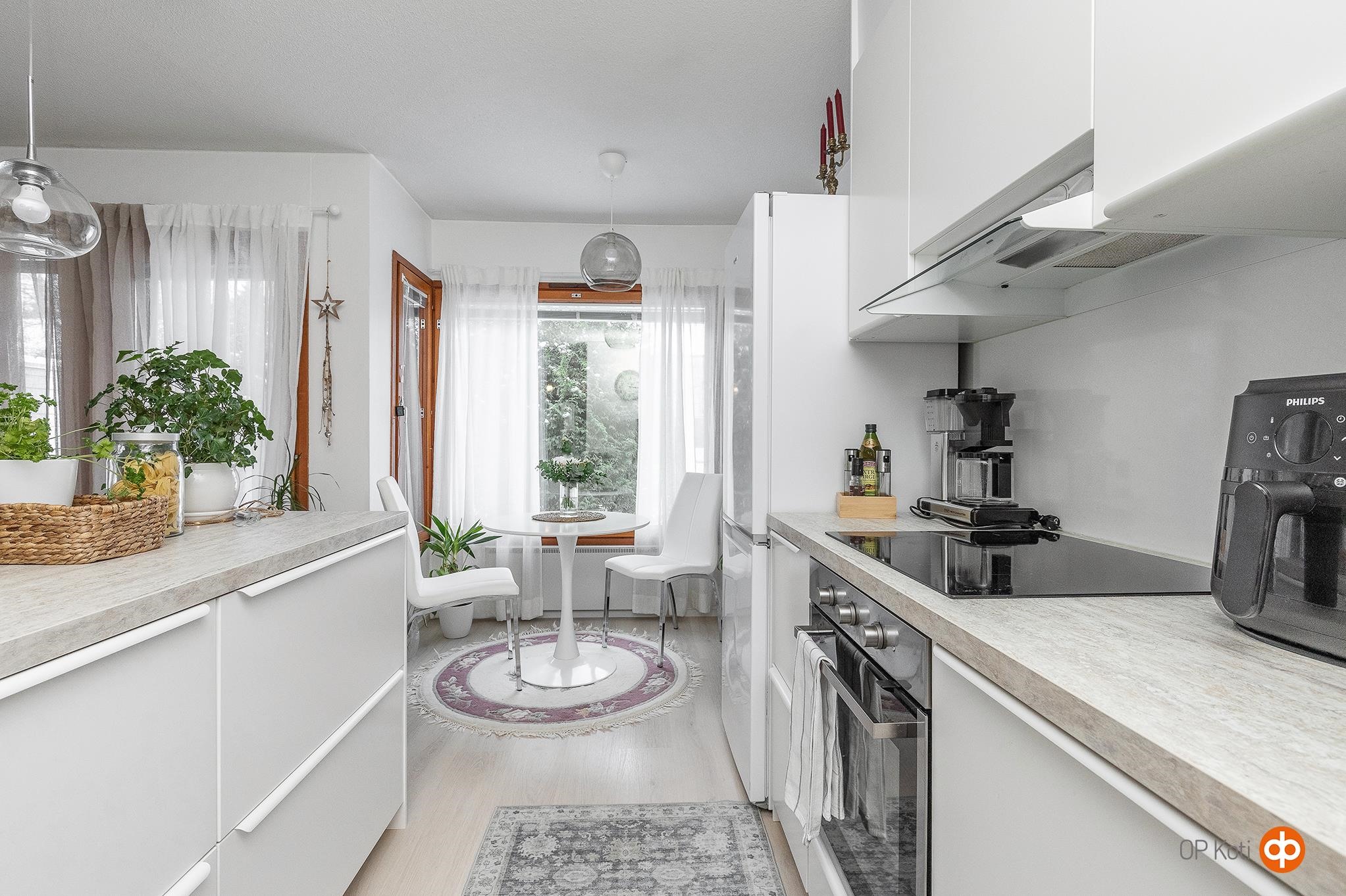 - Jääkaappipakastin uusittu 2022, erillisuuni uusittu 2022, induktioliesi uusittu 2022, liesituuletin uusittu 2022, astianpesukone integroitu, uusittu 2022, kaapistot uusittu 2022, kiinteät valaisimet, kiinteä saareke. Ajattoman tyylikäs valkoinen keittiö vaaleilla tasoilla ja kiinteällä saarekkeella vetolaatikostoineen. Vuonna 2022 kauttaaltaan remontoitu kokonaisuus, jossa remontin yhteydessä olohuoneen ja keittiön välinen seinä poistettu ja korvattu saarekkeella sekä lattia- ja seinäpinnat uusittu. Moderni yhtenäinen ja avara olohuone keittiö tilaratkaisu, jossa keittiöosassa ruokapöydän paikkana erkkerinomainen tila suurine ikkunoineen. Olohuoneesta käynti tuija-aidan suojaamalle takapihalle.