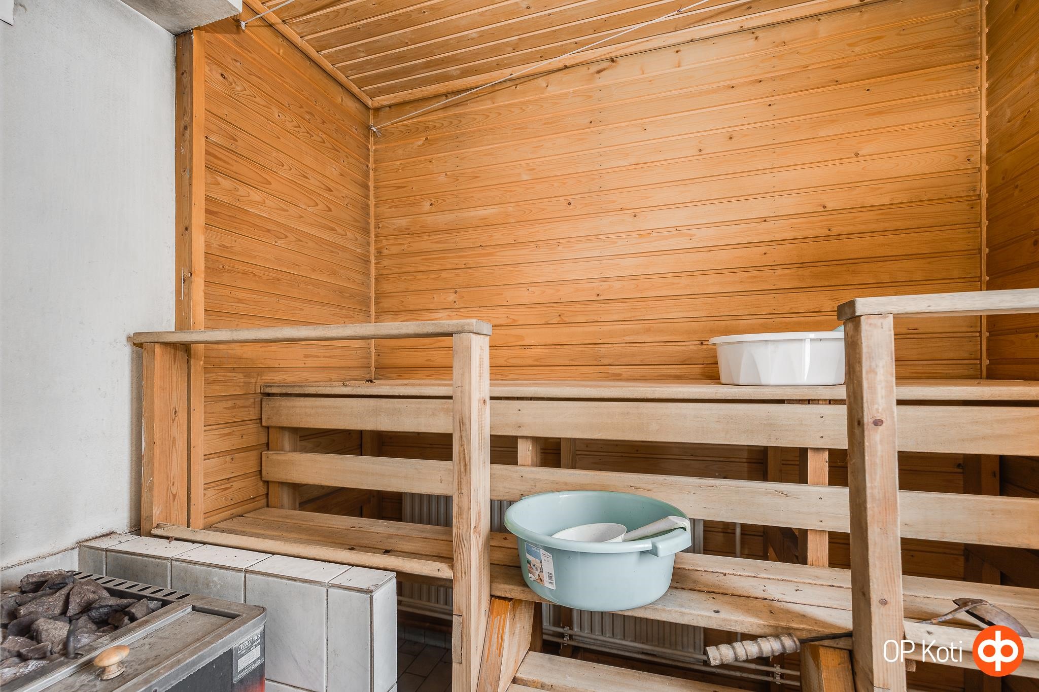 - Sauna, puukiuas, kylpyhuone Wc-istuin, rättipatteri ja bidee-pesuallas., erillinen wc Wc-istuin, allas ja peilikaappi. Lisäksi kylpyhuoneessa on toinen wc-istuin, suihku, peilikaappi Wc:ssä, pesukoneliitäntä Kodinhoitotilassa ( apukeittiö), lattialämmitys Kylpyhuoneessa sähkölämmitteinen. Kylpyhuone ja sauna remontoitu 2000 - luvulla, mutta ovat teknisen käyttöikänsä päässä.