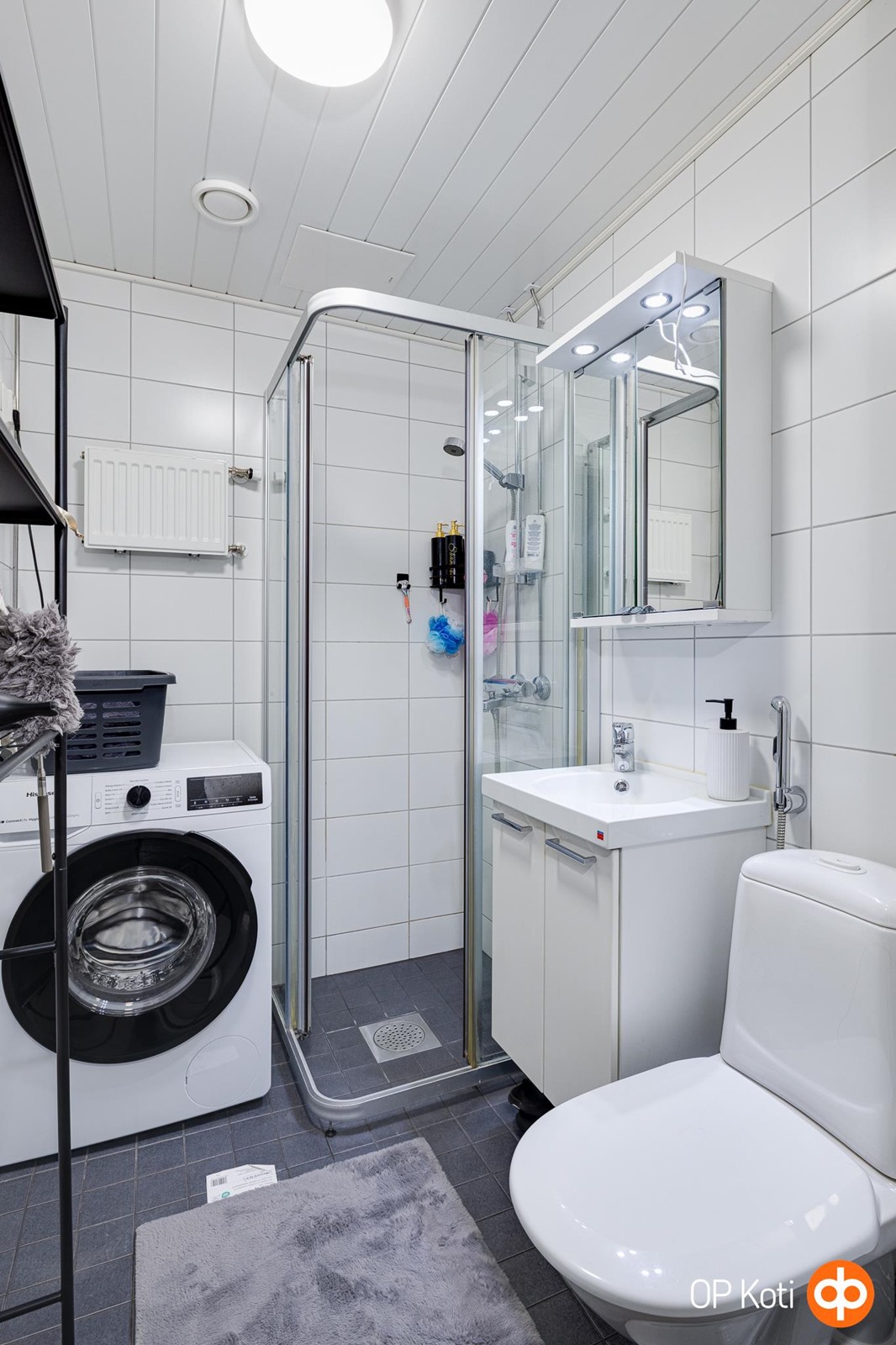 - Kylpyhuone, suihku, suihkuseinä, peilikaappi, allaskaappi, pesukoneliitäntä, lattialämmitys, kiinteät valaisimet.