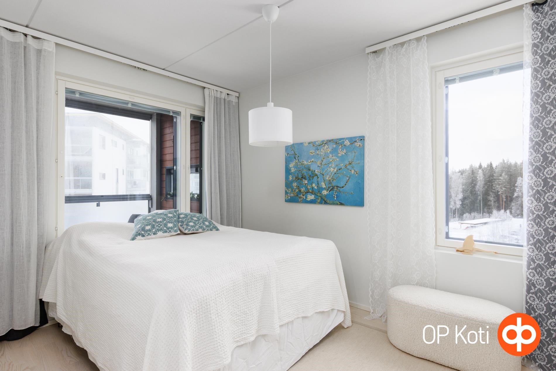 Makuuhuoneessa on reilusti säilytystilaa ja parisänky mahtuu tänne mainiosti. Kylpyhuonetilassa paikka pyykinpesukoneelle ja oma sauna karistaa arjen kiireet pois hartioilta.