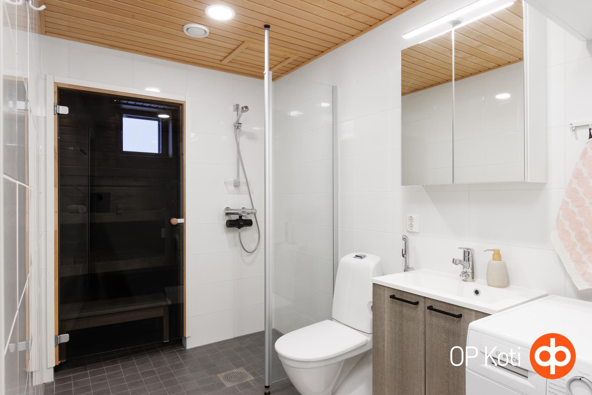 - Sauna, sähkökiuas, kylpyhuone, suihku, suihkuseinä, peilit, peilikaappi, kaapit, allaskaappi, pesukoneliitäntä, lattialämmitys, kiinteät valaisimet.