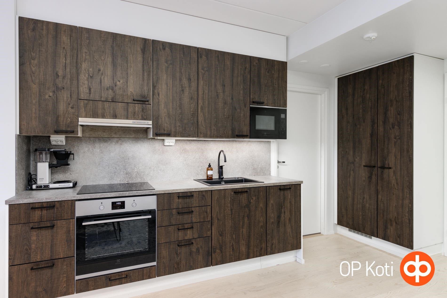 - Jääkaappi, pakastekaappi, erillisuuni, induktioliesi, liesituuletin, mikroaaltouuni, astianpesukone, kaapistot, kiinteät valaisimet.