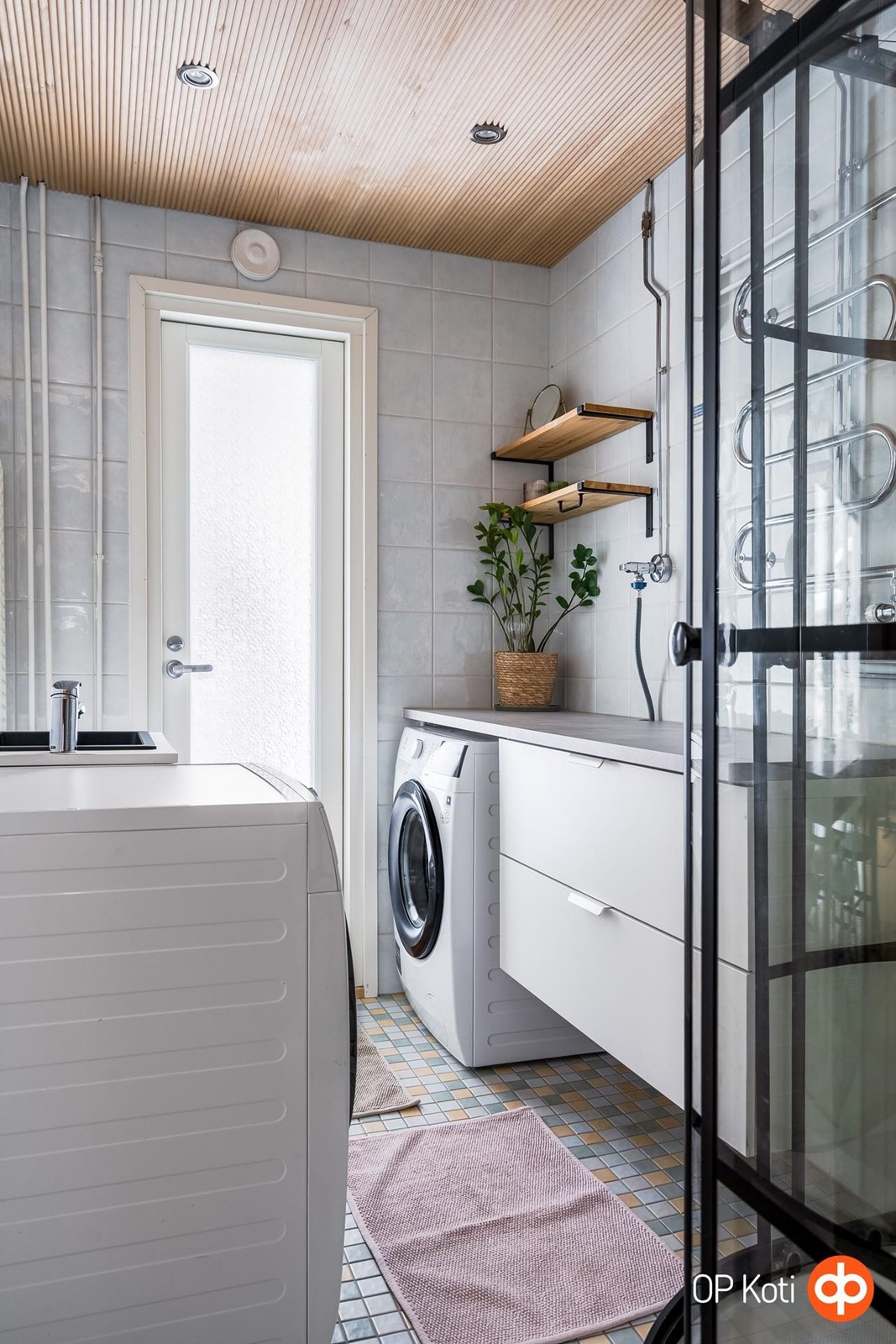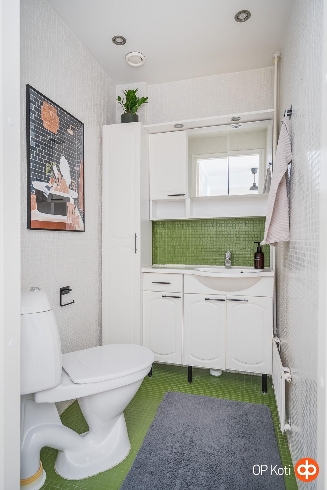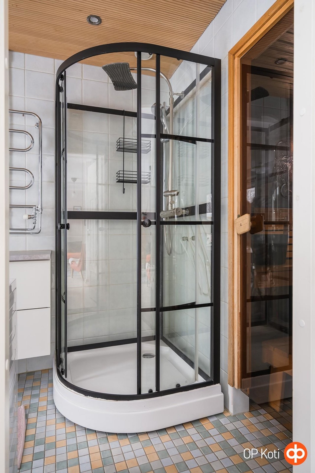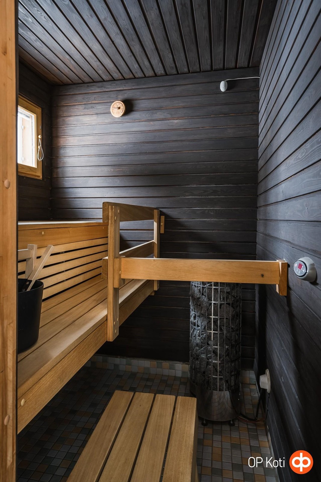 - Kylpyhuone- ja sauna muodostavat viihtyisän ja toimivan kokonaisuuden arjen ja rentoutumisen tarpeisiin. Tilavassa kylpyhuoneessa on suihkukaappi, runsaasti säilytystilaa kaapistoissa sekä pesukoneliitäntä. Kiinteät valaisimet ja peilipinnat tuovat tilaan valoa ja avaruutta. Oman saunan lämpö kutsuu rentoutumaan - sähkökiuas tarjoaa lempeät löylyt silloin, kun kaipaat hetken omaa aikaa. Erillinen wc-tila lisää arjen sujuvuutta ja on varustettu peili- sekä allaskaapilla, jotka tarjoavat käytännöllistä säilytystilaa. Kokonaisuus on huoliteltu, toimiva ja ajattoman selkeä - tilat, jotka palvelevat hyvin niin kiireistä arkea kuin rauhallisia hetkiäkin.