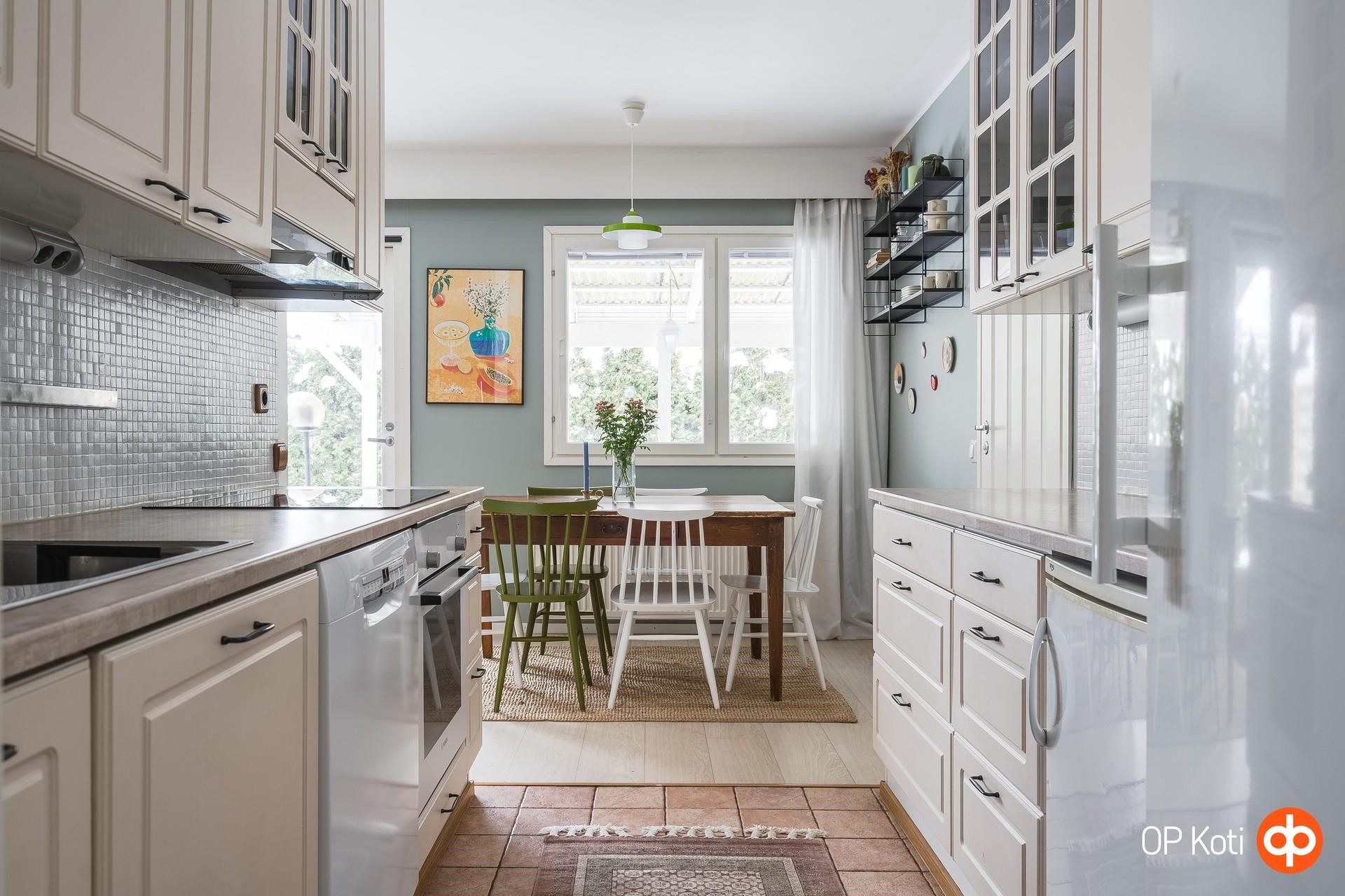 - Keittiö on kodikas ja toimiva kokonaisuus, jossa ruoanlaitto ja yhdessäolo sujuvat luontevasti. Käytännölliset kaapistot tarjoavat runsaasti säilytystilaa, ja erillinen täyskorkeajääkaappi sekä pakastekaappi (1/2) helpottavat arjen järjestelyjä. Induktioliesitaso ja erillisuuni innostavat kokkaamaan, ja astianpesukone huolehtii sujuvasta arjesta. Liesikupu ja kiinteät valaisimet viimeistelevät keittiön miellyttävän ja viihtyisän tunnelman. keittiössä on vuoden 2023 lopulla uusittu astianpesukone sekä liesi ja uuni.