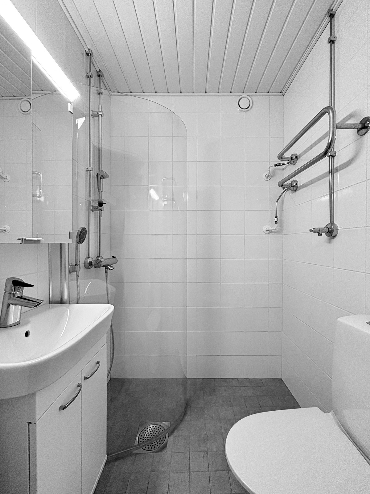 - Kylpyhuone, suihku, suihkuseinä, peilikaappi, allaskaappi, pesukoneliitäntä, kiinteät valaisimet. kuivauspatteri