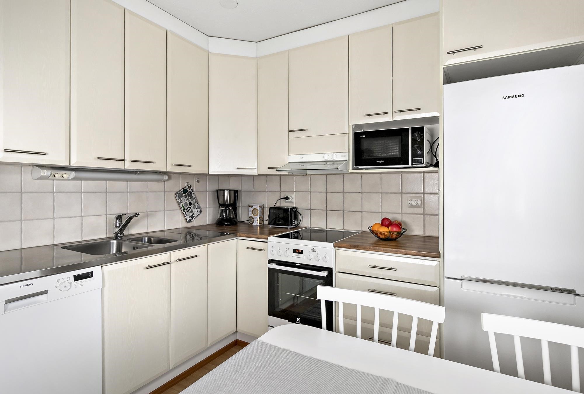- Jääkaappipakastin, induktioliesi, liesituuletin, astianpesukone, kaapistot, kiinteät valaisimet. Keittiö avautuu olohuoneeseen (avokeittiö).