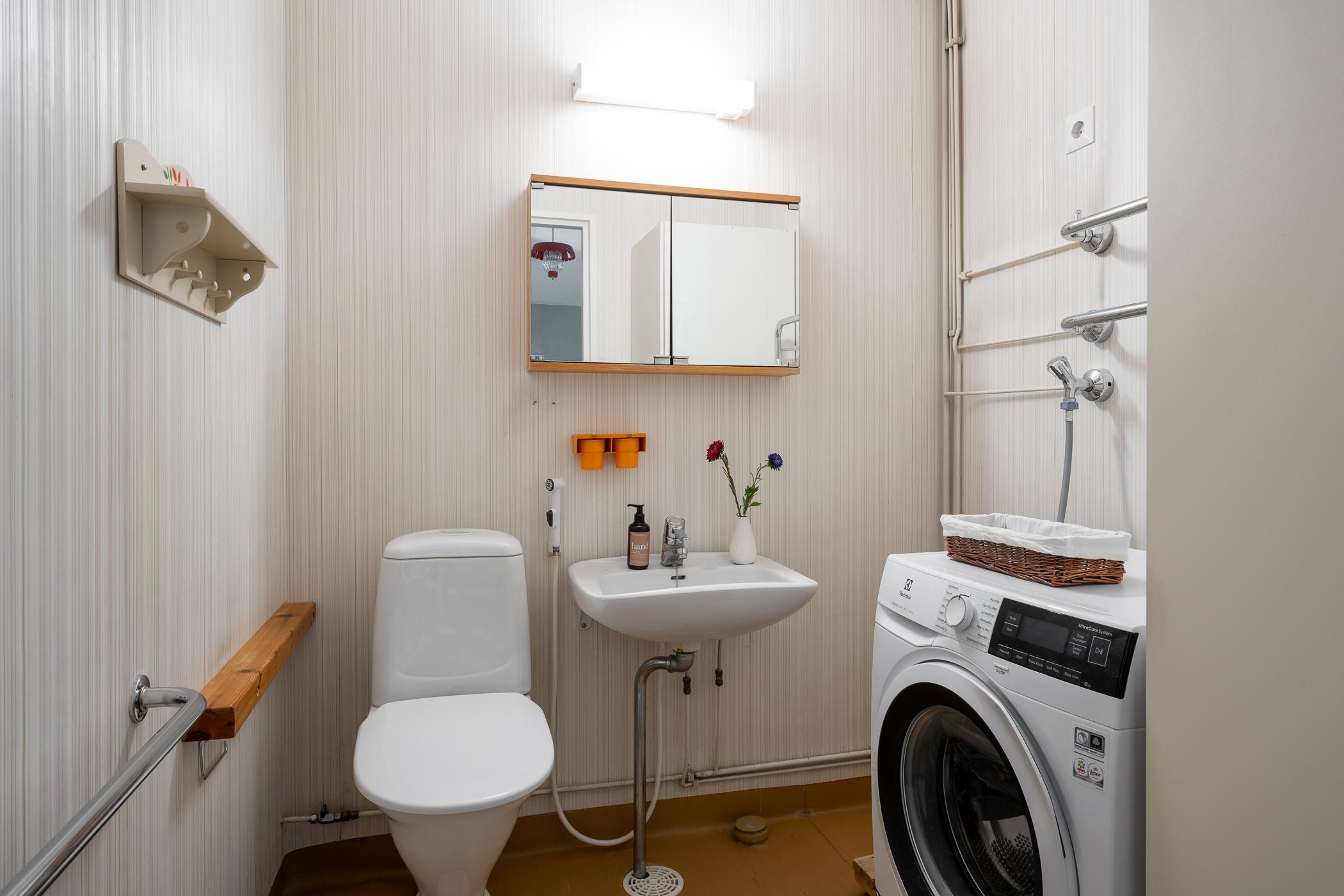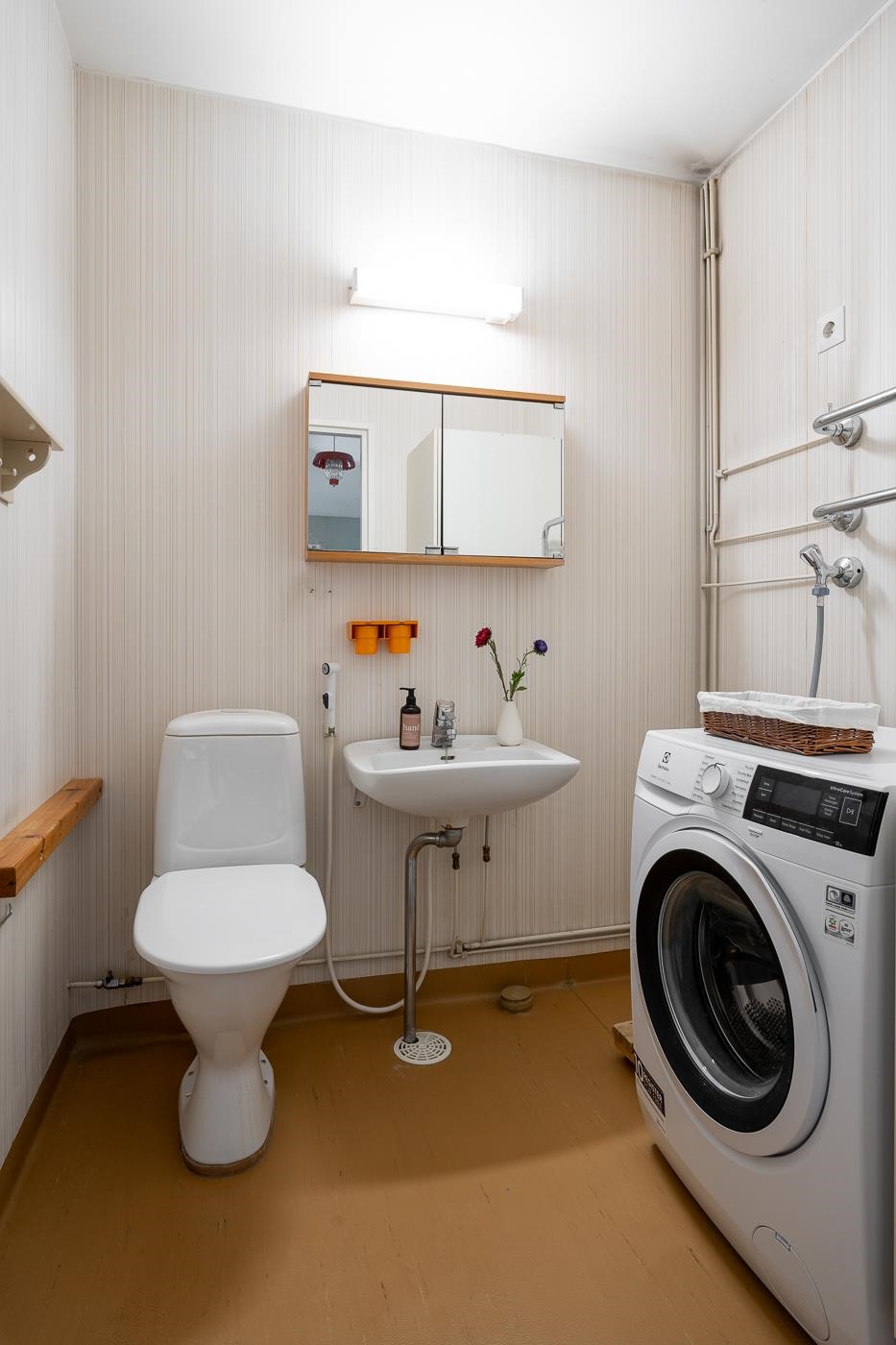 Asunnossa on aivan erillinen wc ja siellä on asiallinen tila pesukoneelle, mikä onkin jo valmiina seuraavalle käyttäjälle. Tilassa on myös vesikiertoinen pyyhepatteri. Kylpyhuone on sopivan kokoinen ja saahaan siitä varmasti upean remontoimalla ja onhan tässä kaksiossa vielä oma saunakin löylyttelyyn.