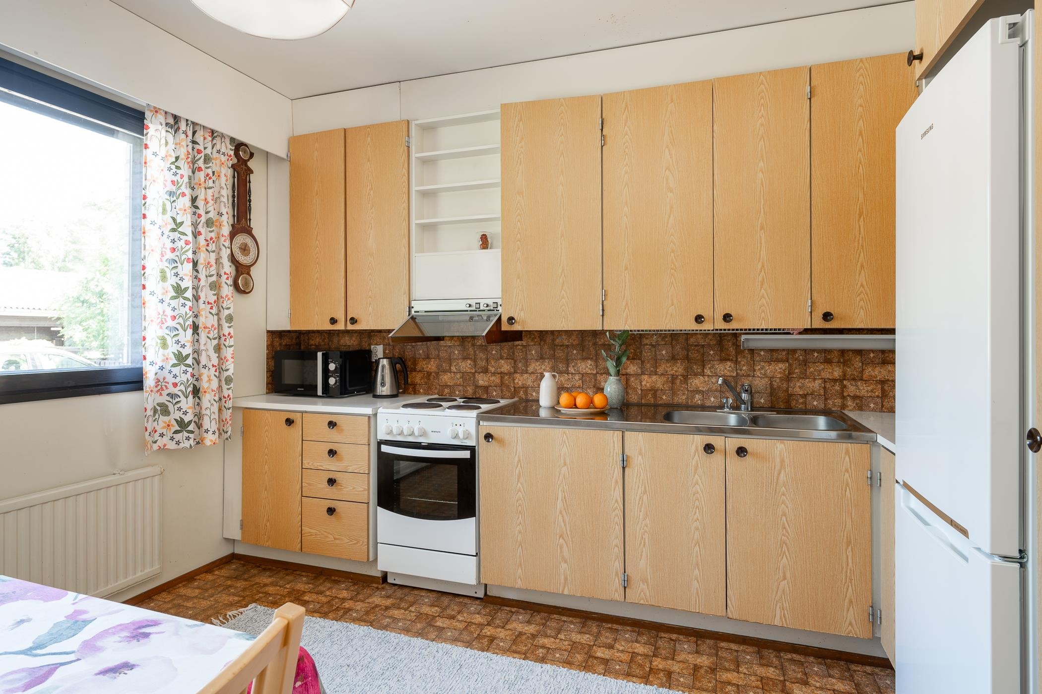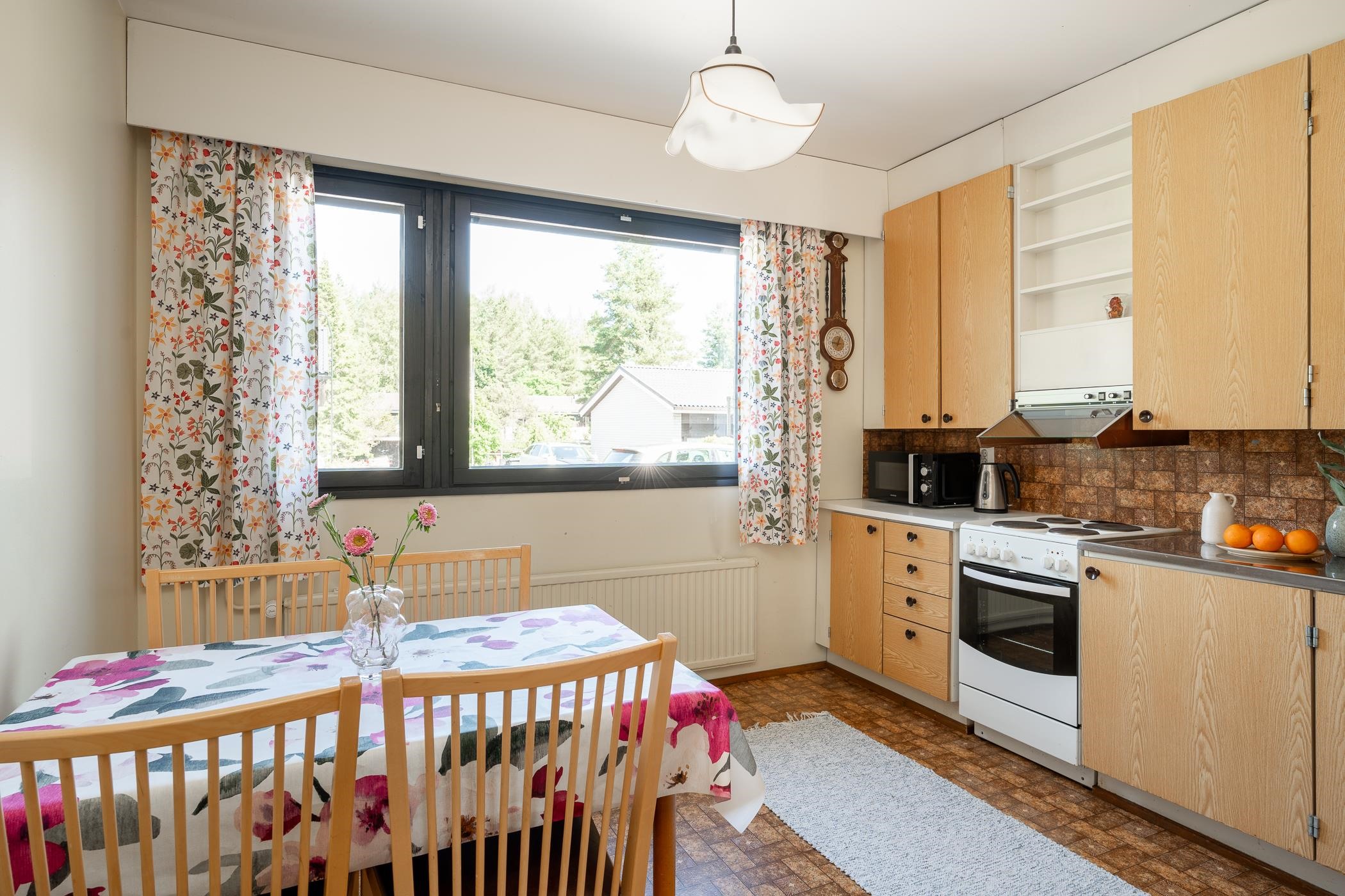 - Jääkaappipakastin (uusittu 2020), sähköliesi, liesikupu (huippuimurin ohjauksella), kaapistot, kiinteät valaisimet (työtasovalaisimen pistorasiat ei toimi).
