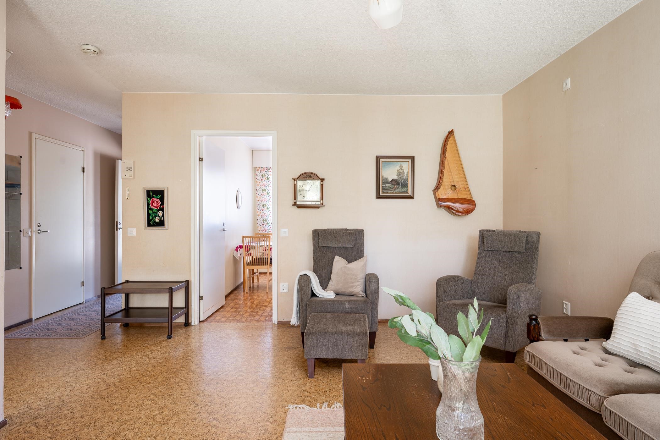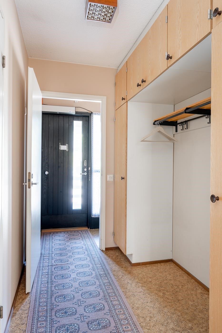 Sisään saavuttaessa eteisestä löytyy kaapisto ja naulakko vaatesäilytykseen. Olohuone on aikakautensa tyylin mukaan avara ja valoisa. Täältä on käynti myös suojaisalle takapihalle. Makuuhuone on varsin tilava, parisänkykin tänne sopii hienosti. Vaatesäilytystä varten on alkuperäiset komerot. Keittiöön mahtuu ruokapöytä kivasti ja sen nykyisellä kaapistollakin vielä pärjäilee. Jääkaappi on uusittu v. 2020. Liesituulettimesta säädetään asunnon poistoilmanvaihtoa.