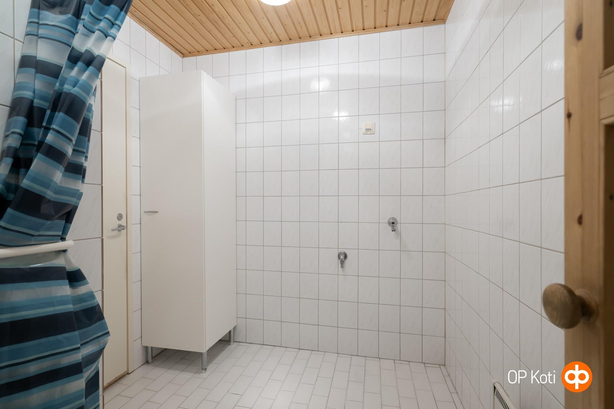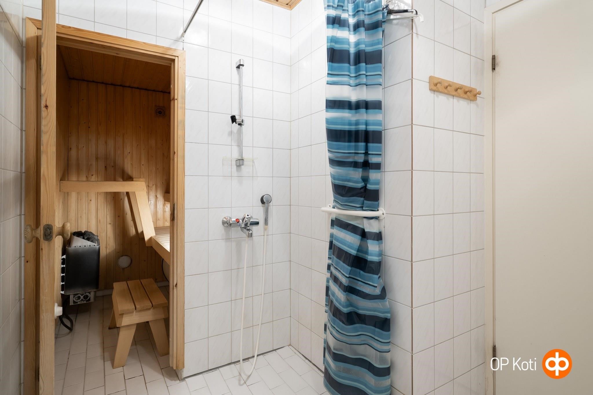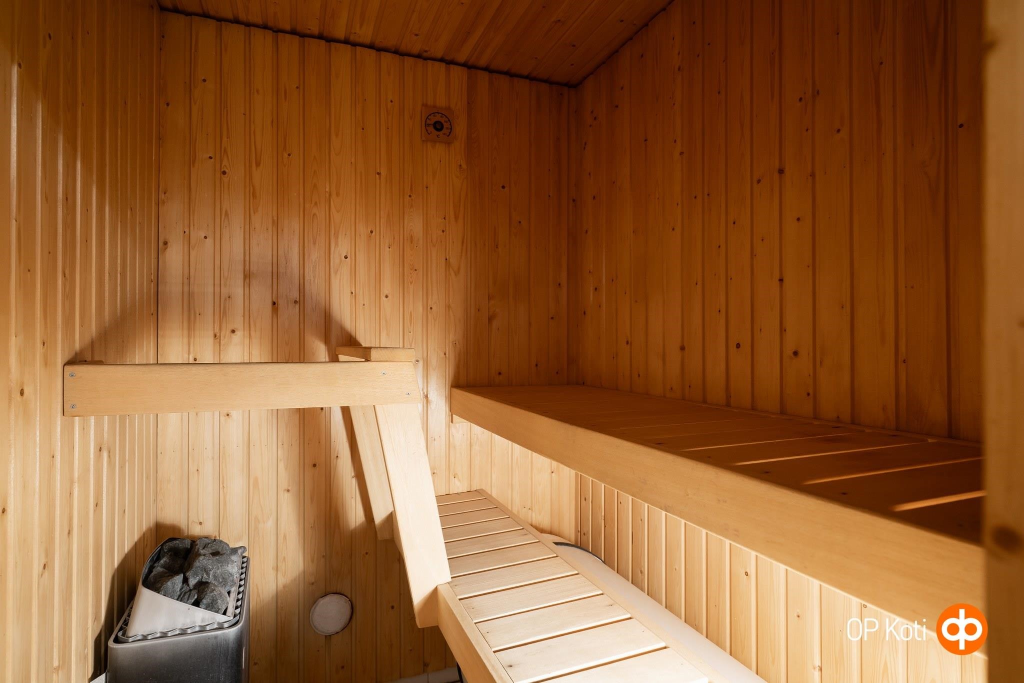- Sauna, sähkökiuas, kylpyhuone, erillinen wc, suihku, peilit (wc:ssä), pesukoneliitäntä, lattialämmitys (sähköinen), kiinteät valaisimet.