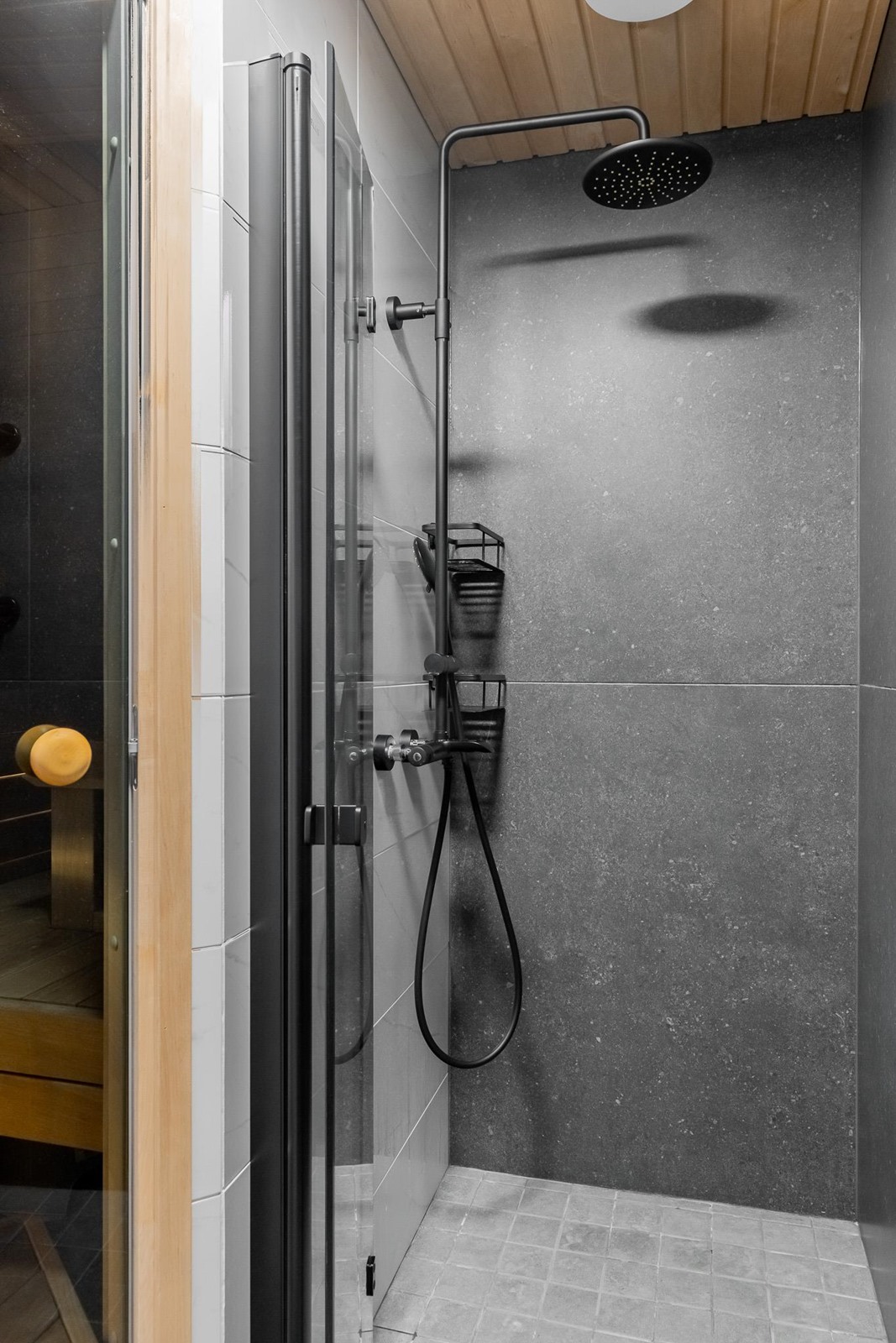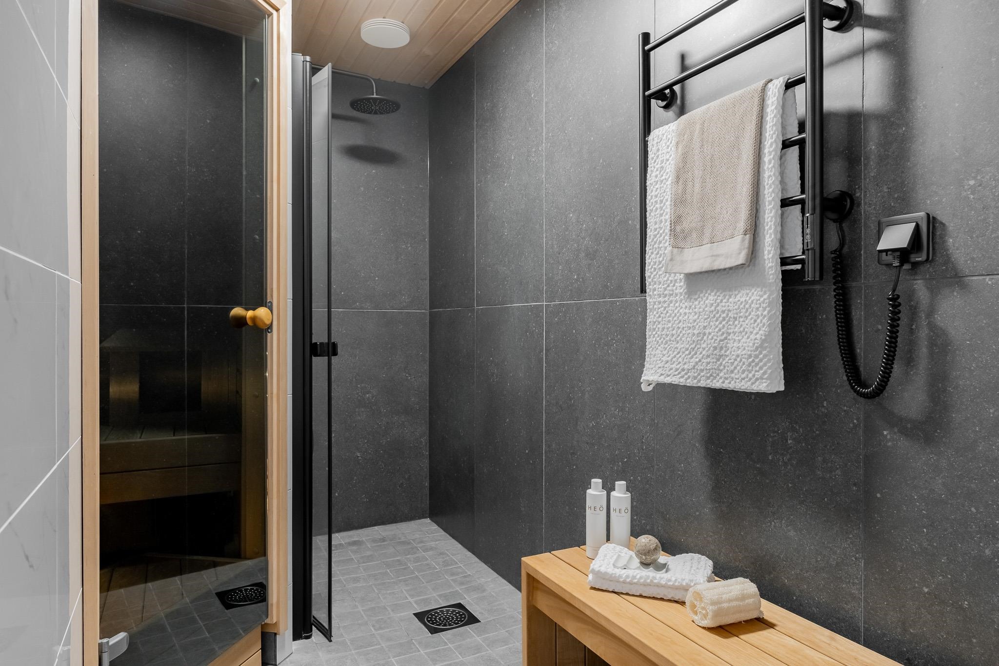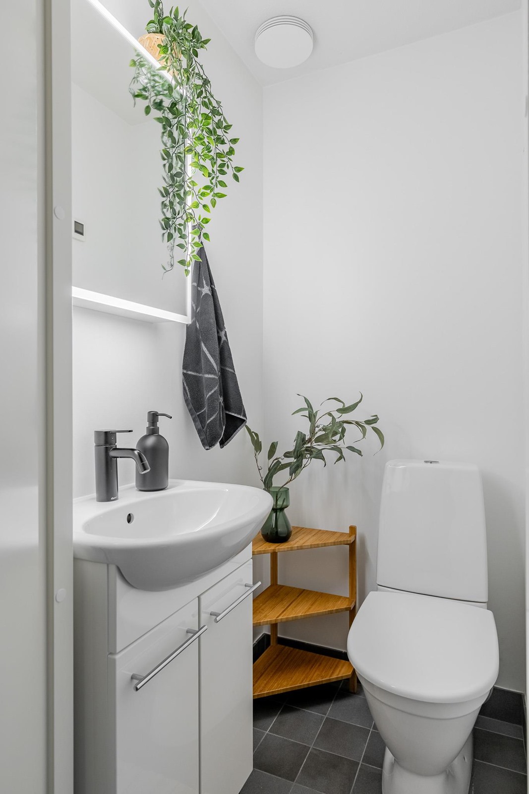 - - Kylpyhuone 2022: suihku, suihkuseinä, pyyhekuivain ja kiinteät valaisimet. - Erillinen wc 2022: allas, allaskaappi, peilikaappi ja bide. - Sauna 2022: sähkökiuas (Alkuperäinen). - Kodinhoitohuone 2022: pesukoneliitäntä, allas, kaapistot, peili ja kaapit. Lattialämmitys: kylpyhuone, kodinhoitohuone ja wc
