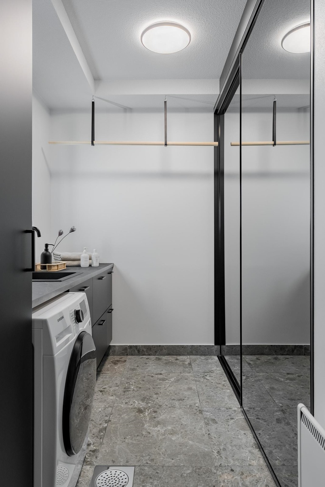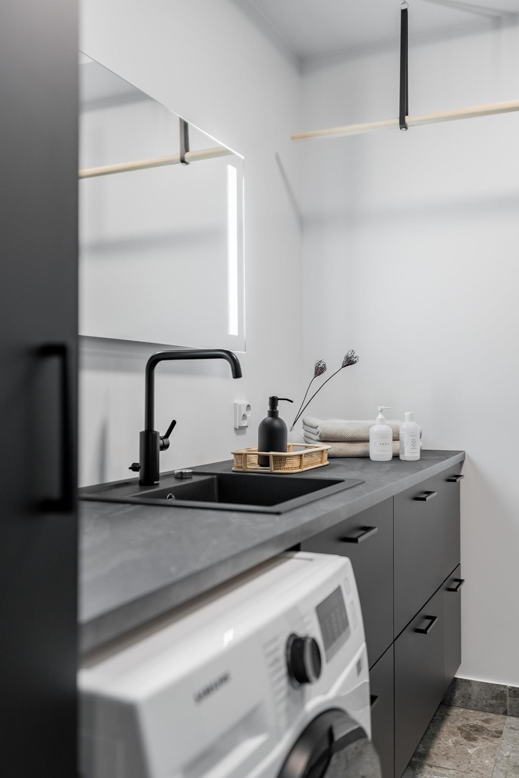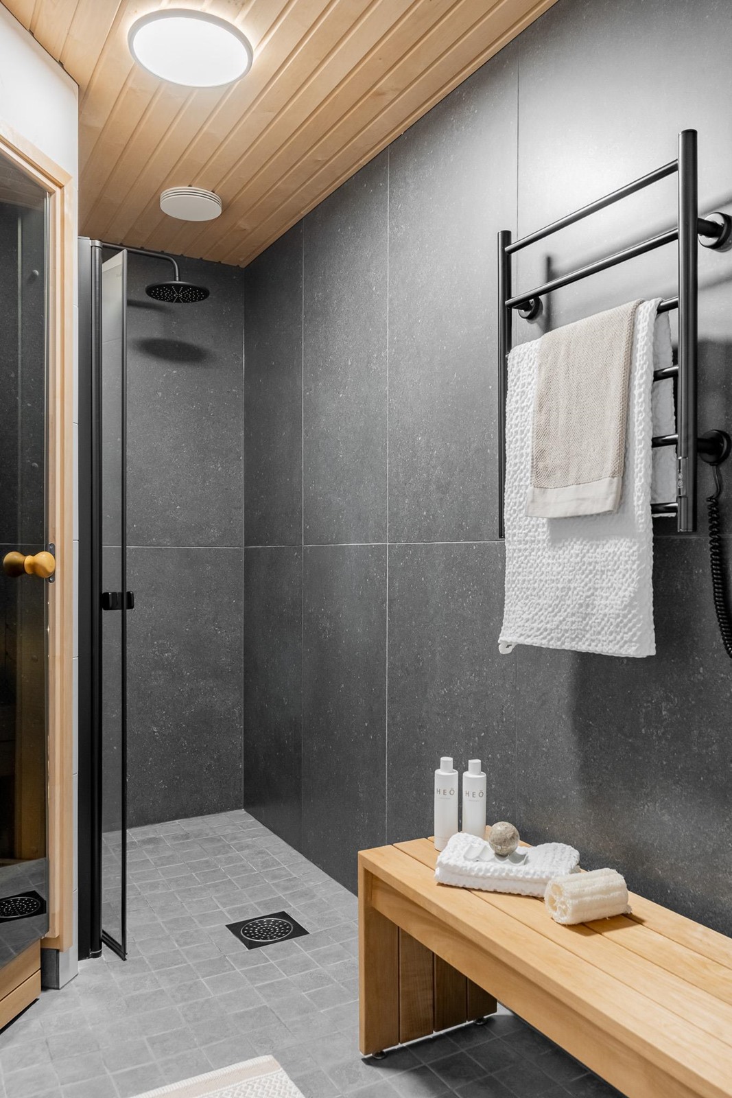 - - Kylpyhuone 2022: suihku, suihkuseinä, pyyhekuivain ja kiinteät valaisimet. - Erillinen wc 2022: allas, allaskaappi, peilikaappi ja bide. - Sauna 2022: sähkökiuas (Alkuperäinen). - Kodinhoitohuone 2022: pesukoneliitäntä, allas, kaapistot, peili ja kaapit. Lattialämmitys: kylpyhuone, kodinhoitohuone ja wc