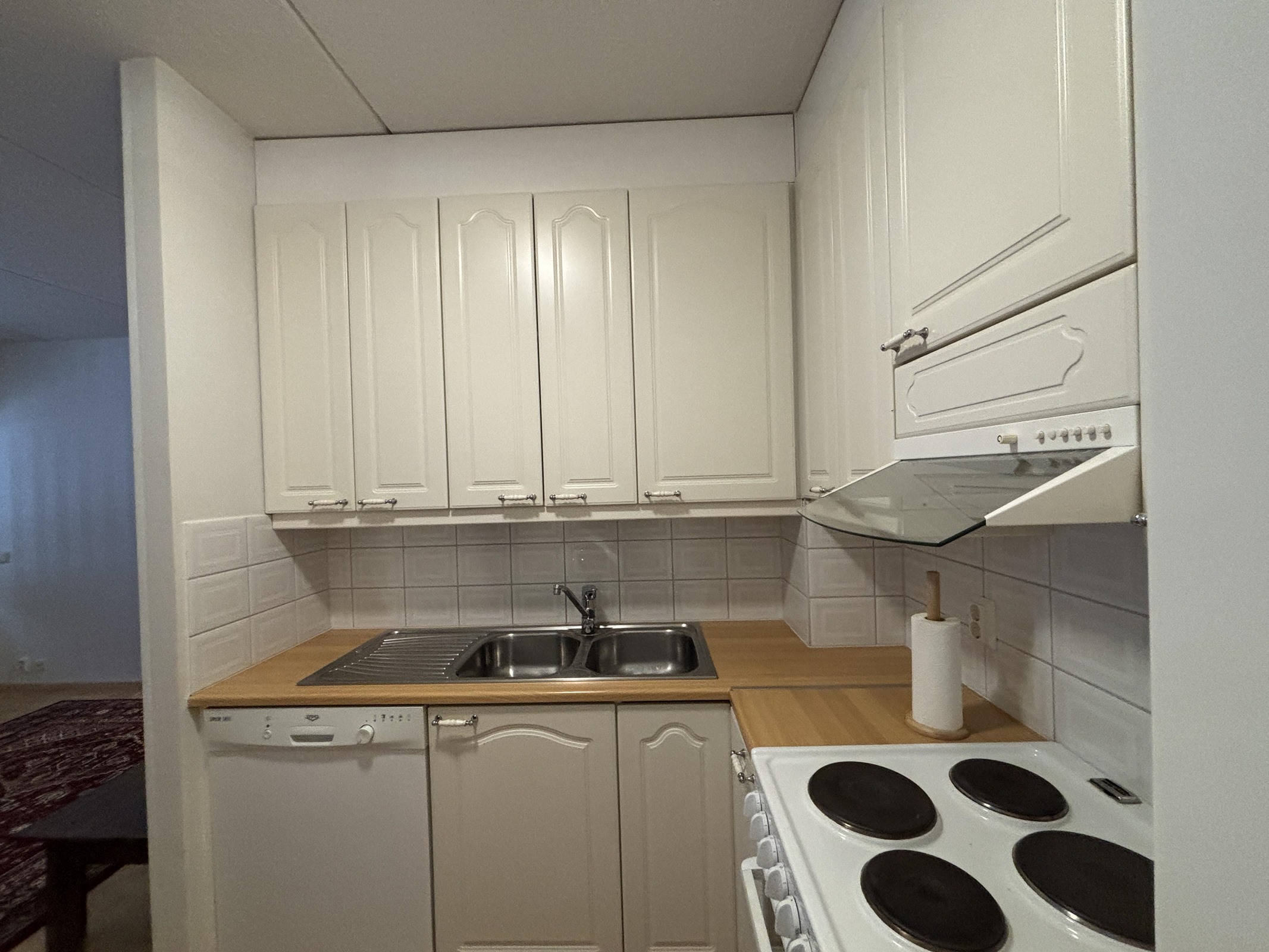 - Keittiön varustuksena jääkaappipakastin, sähköliesi, liesituuletin, astianpesukone, sekä vaaleat kaapistot.