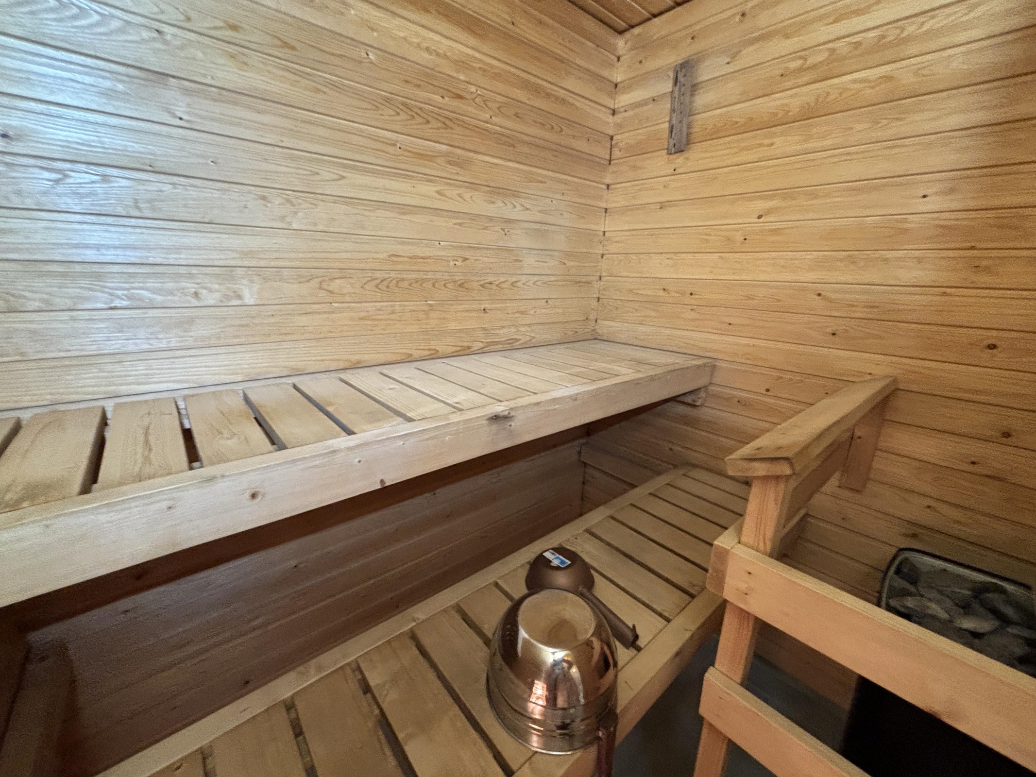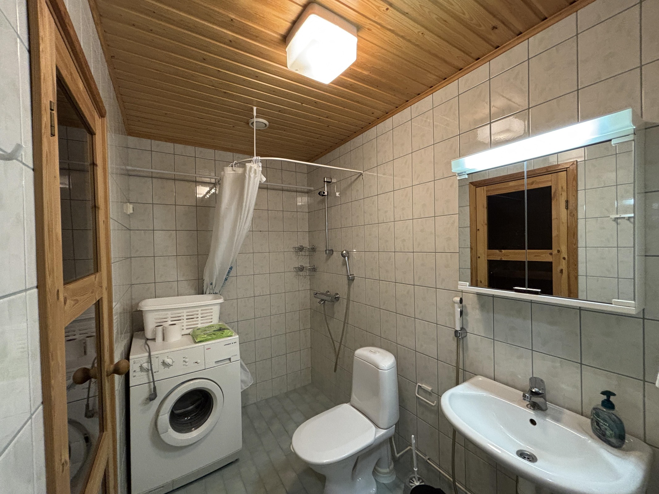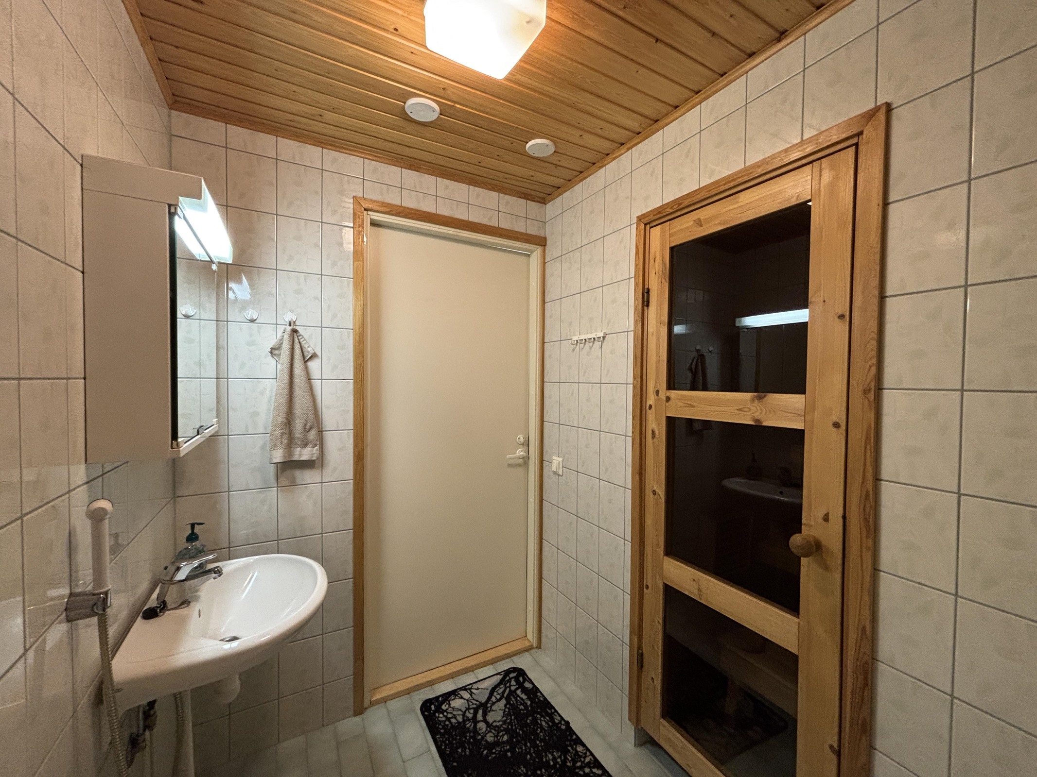 - Saunassa sähkökiuas. Kylpyhuoneessa, suihku, peilikaappi, allaskaappi, pesukoneliitäntä, ja lattialämmitys.