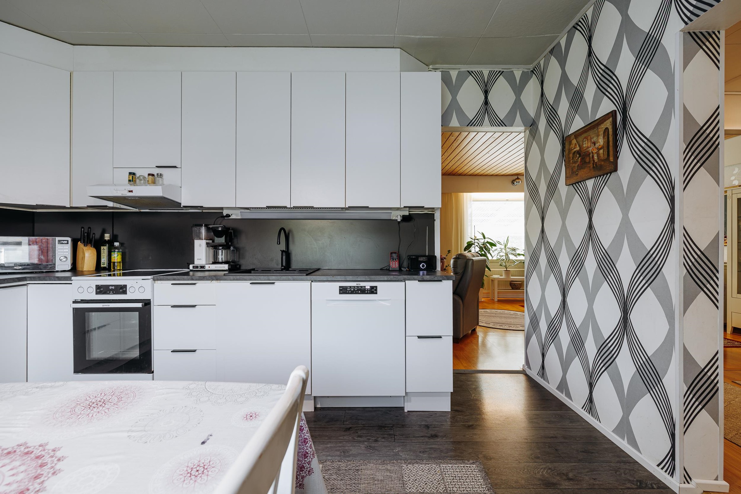 - Jääkaappi, pakastekaappi, liesitaso, keraaminen liesi, liesituuletin, astianpesukone, kaapistot, kiinteät valaisimet, pöytätasojen materiaali.